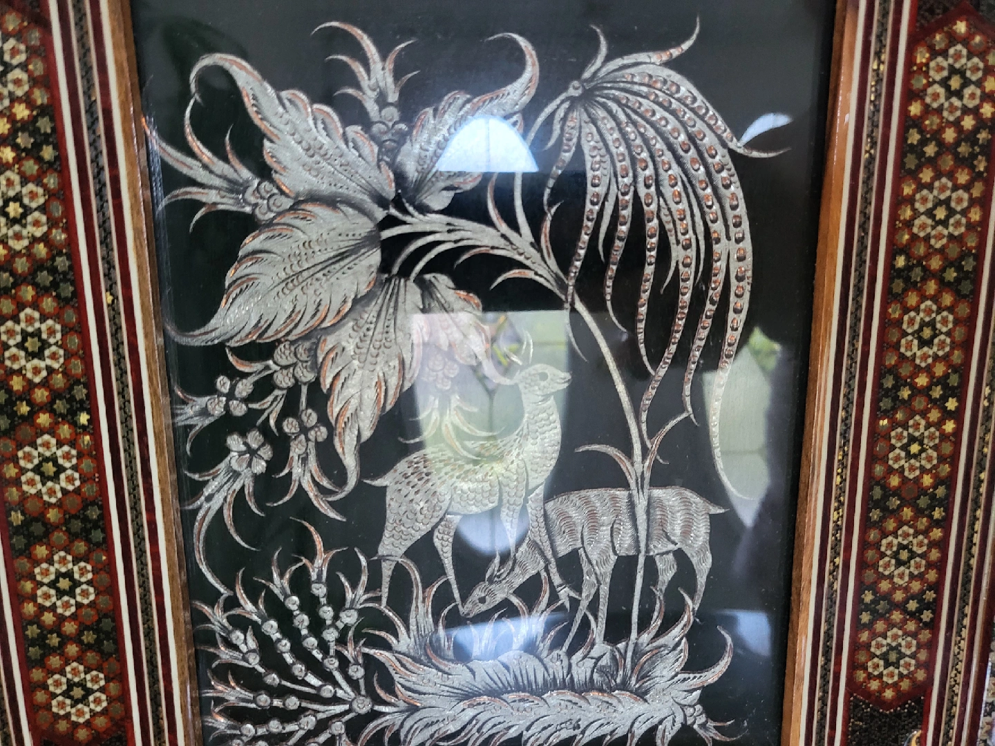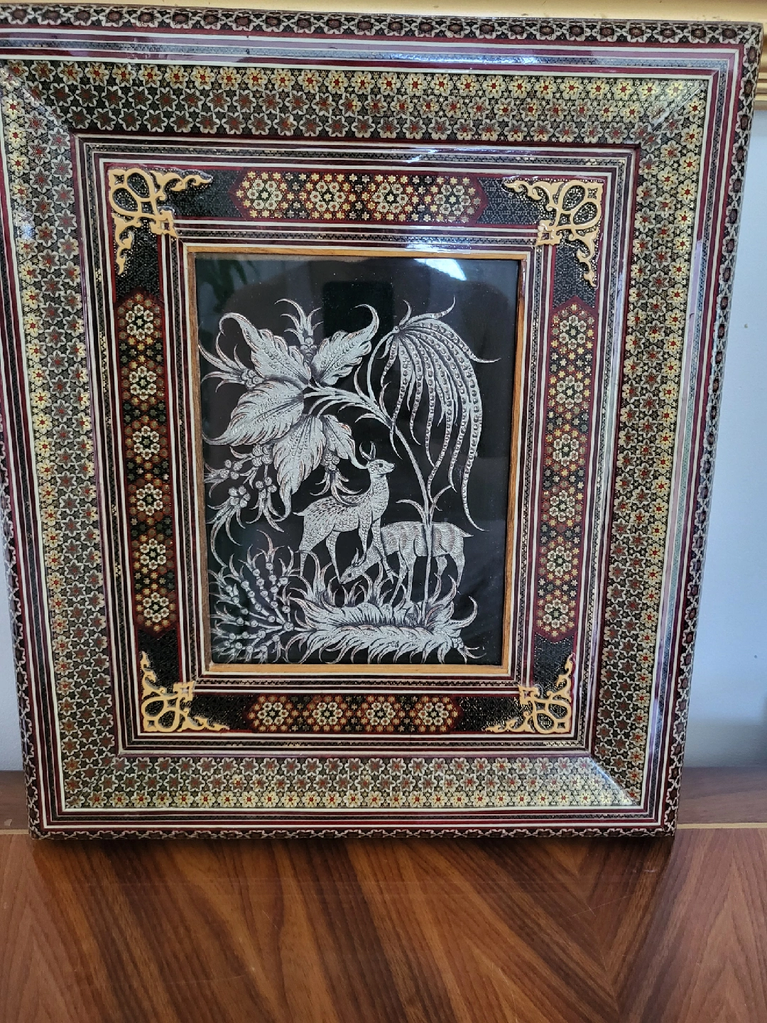 Beautiful vintage marquetry art picture frame. The frame features intricate designs and a stunning depiction of deer and foliage. It's a unique piece to add to your home decor collection! The frame is in good condition.