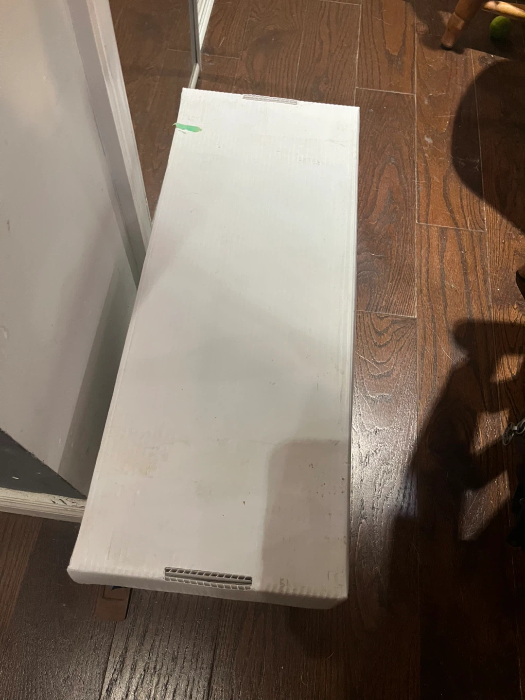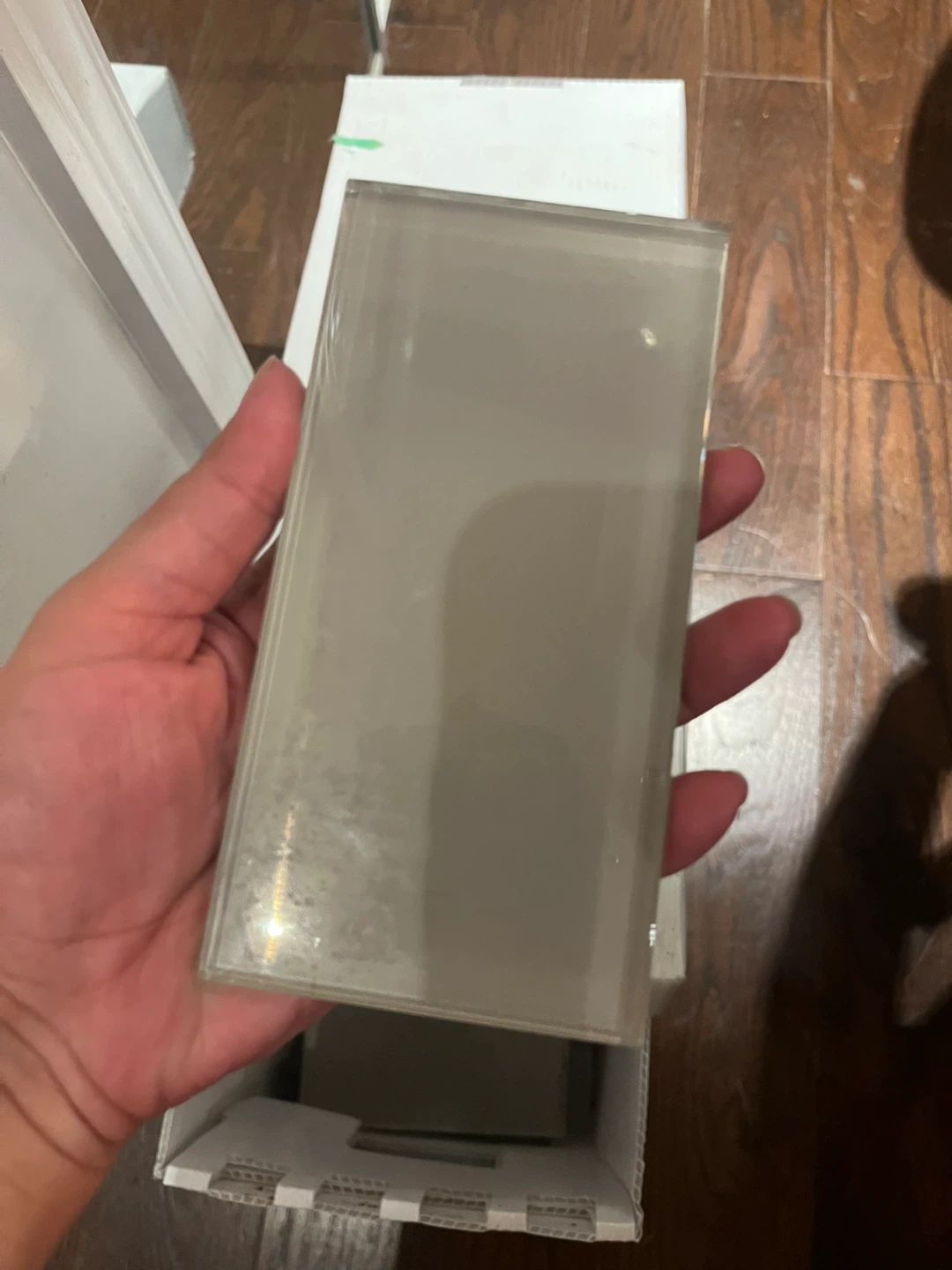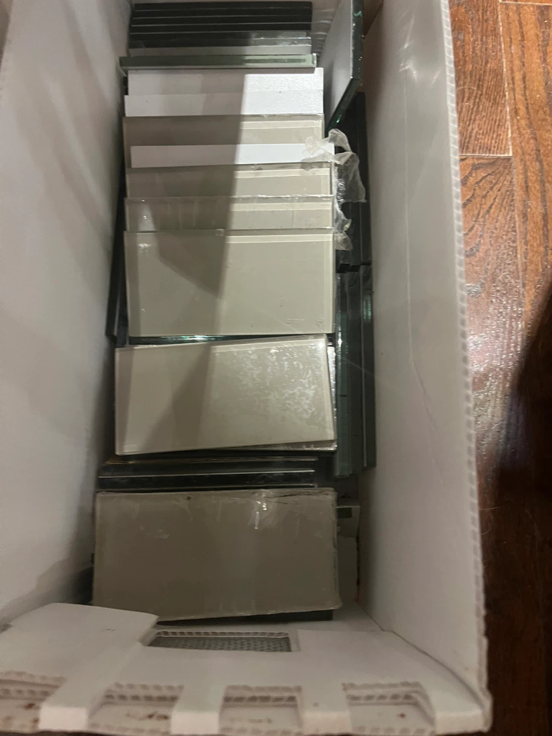 A box of leftover glass wall tiles. They are a beige colour. The box is included!