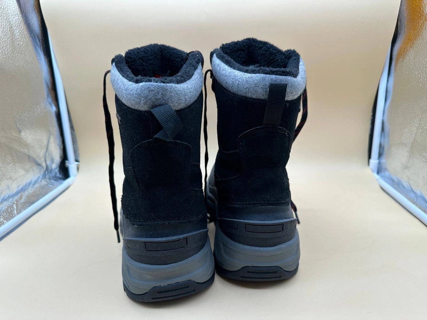 54https://www.mountainwarehouse.com/ca/ Black winter boots with thick, cozy lining for warmth. They have sturdy soles for good grip and red-accented laces. Perfect for cold and snowy weather! ❄️ 99% new Size: US12