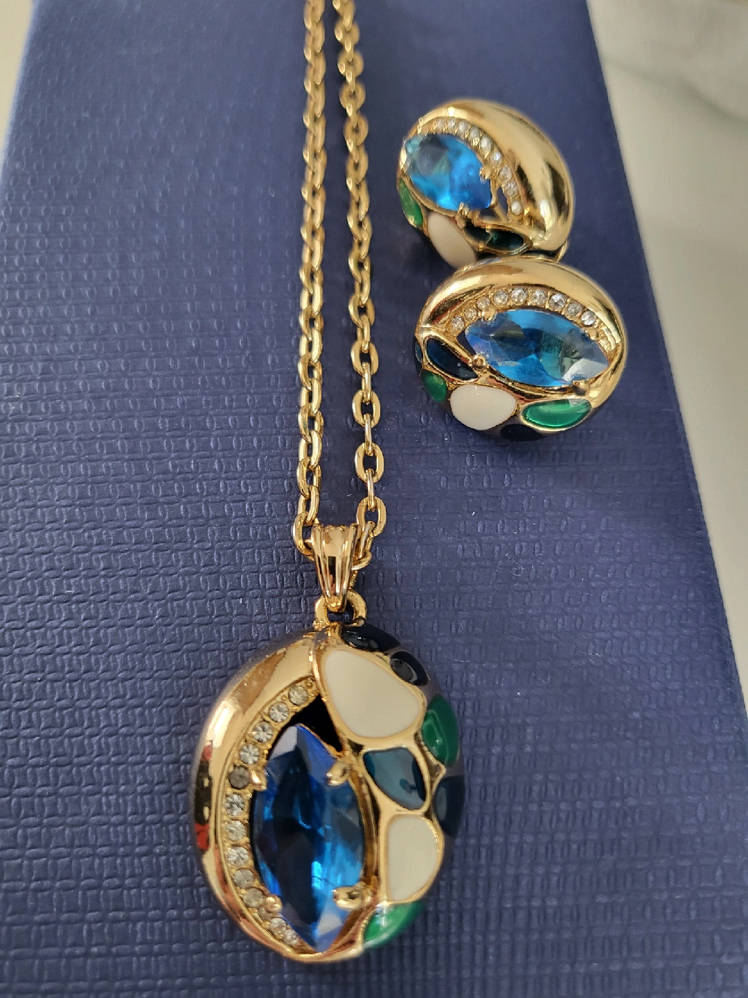 Beautiful necklace and earring set with a gold-tone finish and blue stones. The set has a unique design with white and green accents. Perfect for adding a touch of elegance to any outfit