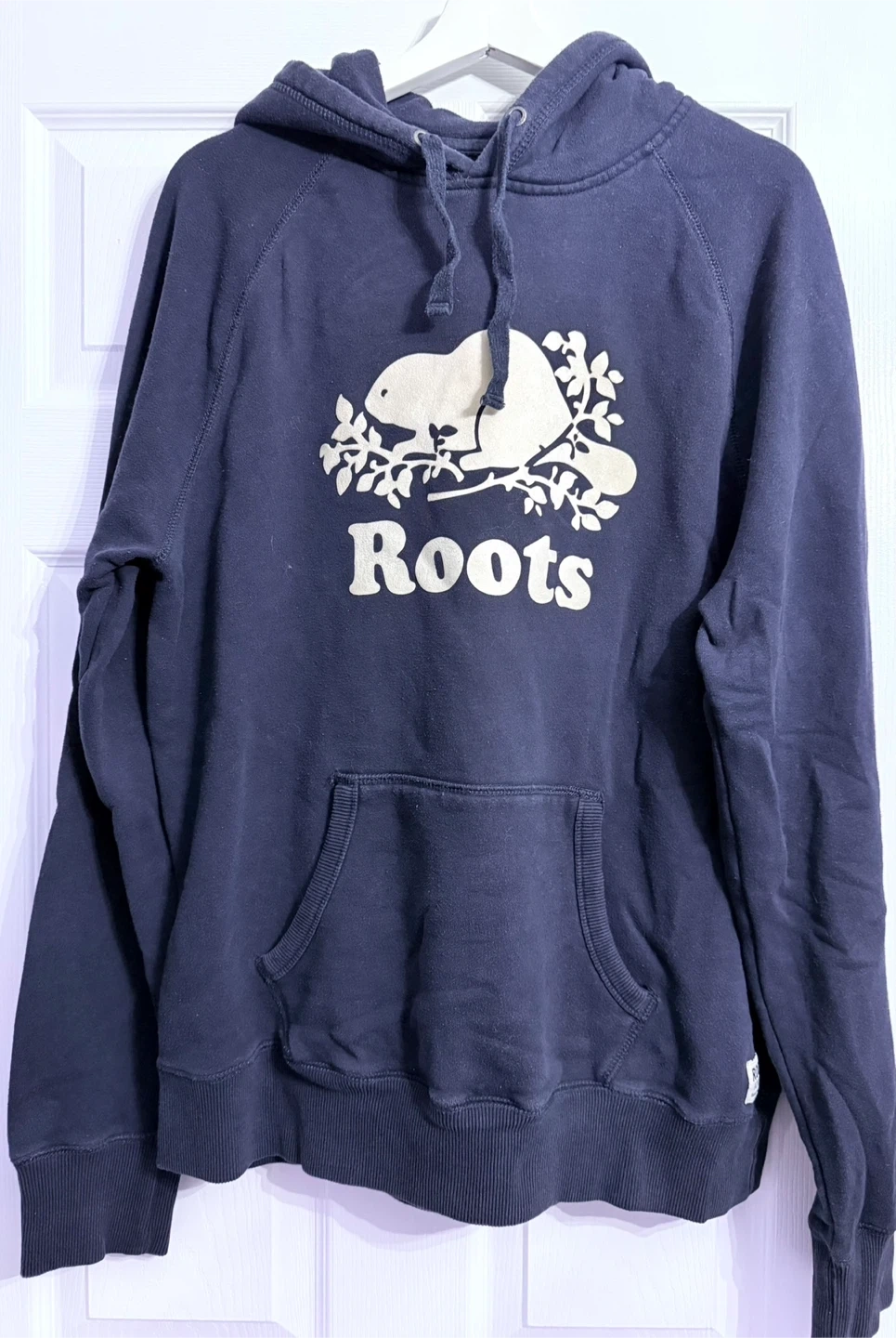 Selling a comfy Roots Canada hoodie in navy blue! It's a size large and features the classic Roots beaver logo. A great addition to your casual wardrobe! Unisex