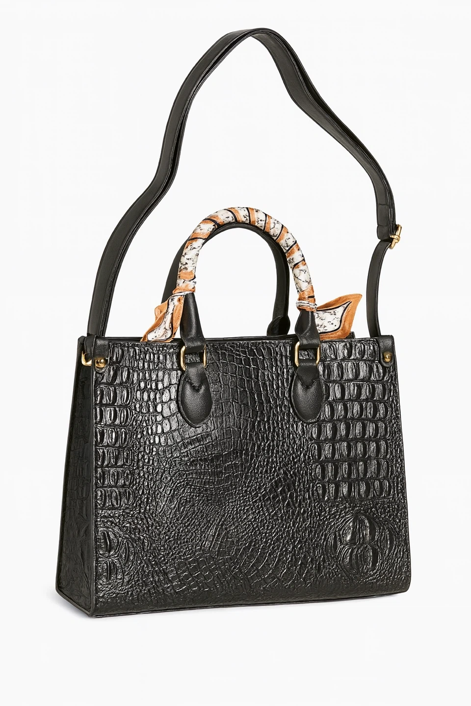 Glossy Croc-Embrossed Handbag with Silk Scarf
