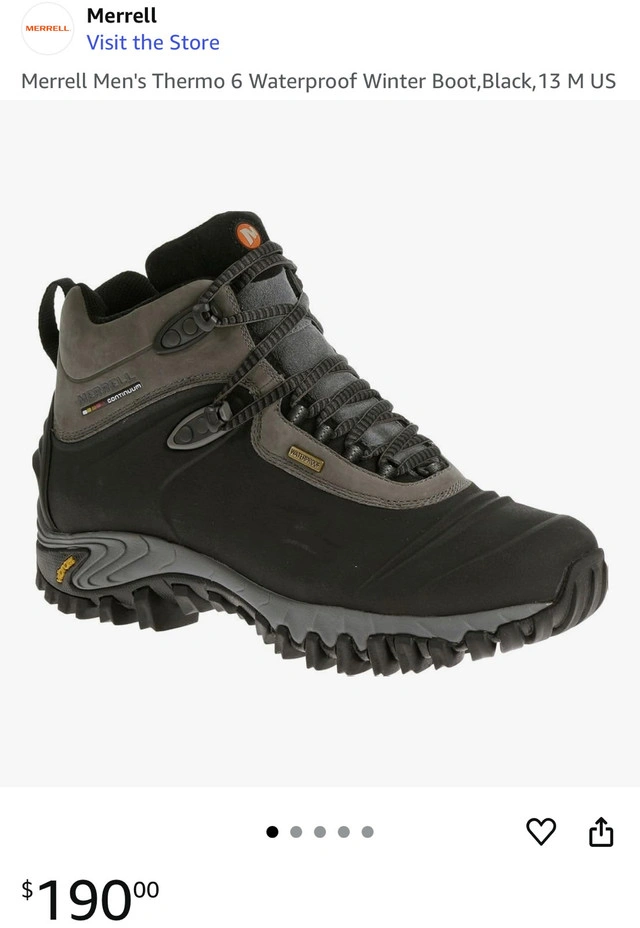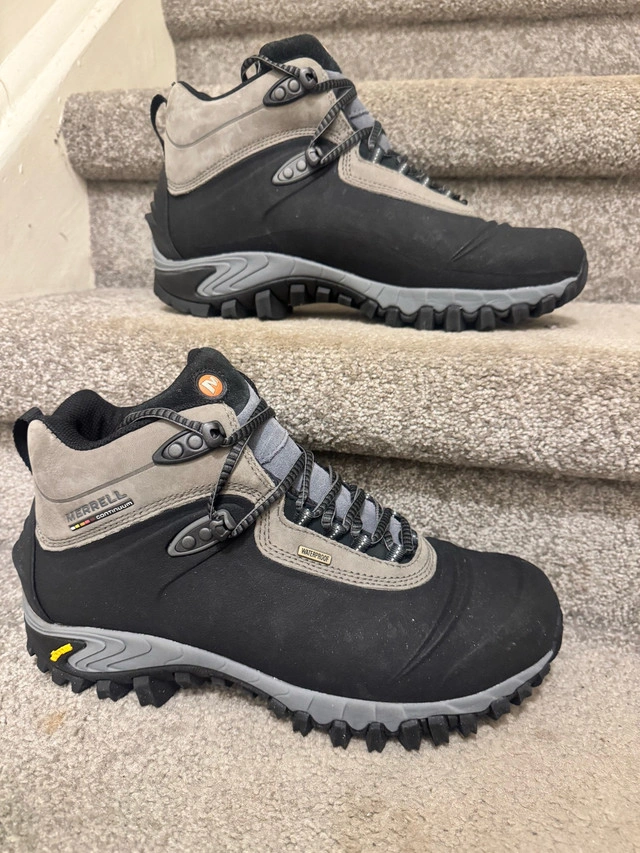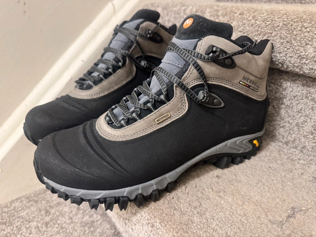 Step into winter with confidence in these Merrell Thermo 6 waterproof winter boots, perfect for braving the Canadian cold! These boots feature 200g of insulation to keep your feet warm and a sturdy Vibram sole for excellent traction on icy surfaces. While they've been on a few snowy adventures, they are still in good condition, ready for many more.