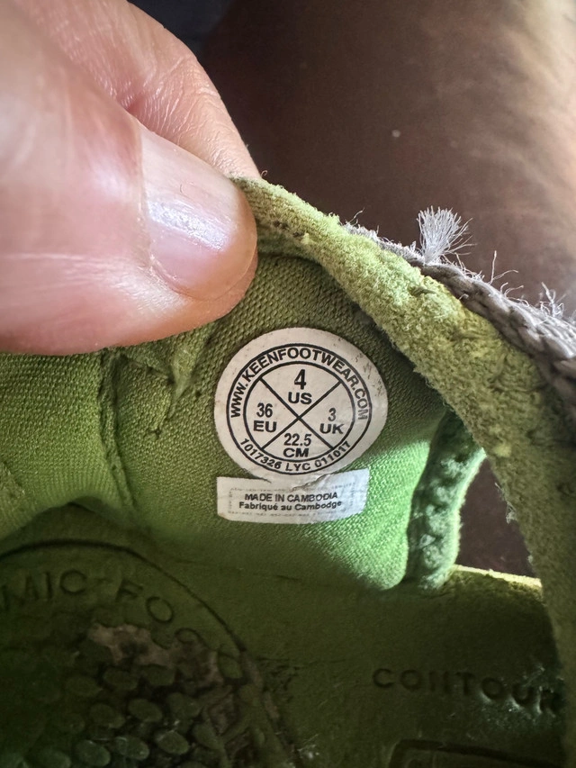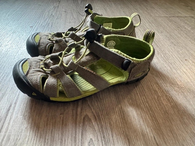 These are a pair of used Keen sandals, perfect for active kids, size 4 US, with a secure fit and durable construction. They have been worn, so they have some wear, but they're still ready for more adventures.
