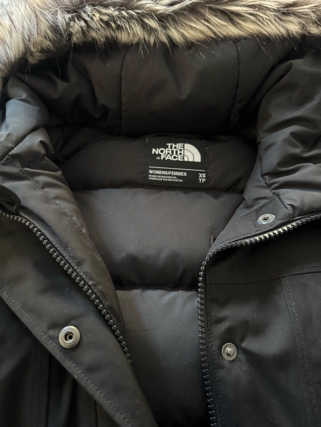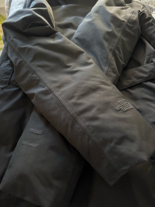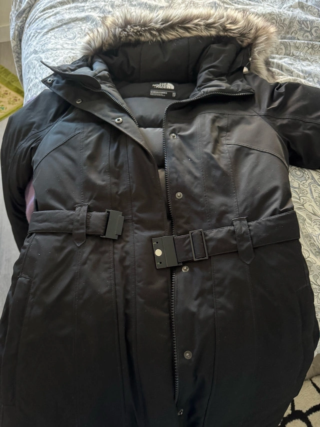 I'm selling a used The North Face parka in extra-small size, perfect for staying warm and stylish during the colder months. This jacket features a 550 down fill for excellent insulation and a DryVent shell for water resistance, ensuring you stay dry and comfortable. This jacket has a belt around the waist. Here are some additional specifications: * Size: XS * Insulation: 550 Down Fill * Outer Shell: DryVent (Water Resistant) * Colour: Black * Faux Fur Trim on Hood I'm asking $180 for this parka. If you're seeing this ad, the parka is still available! Don't miss out on the chance to add this fantastic jacket to your winter wardrobe!