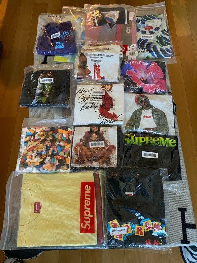 86Selling brand new SUPREME HOODIES SWEATSHIRTS, ALL ARE IN BRAND NEW INSEALED UNWORN CONDITION. CASH DEAL SELF PICK UP IN MARKHAM. THX SUPREME KNIT STRIPE tee YELLOW LARGE $50 SUPREME DYNAMITE TEE BLACK LARGE SS19 $100 SUPREME PILLS TEE FW20 WHITE LARGE $80 SUPREME SHREK TEE FW21 BLACK LARGE $80 SUPREME LIL KIM TEE SS22 LARGE $100 SUPREME ANDRE 3000 TEE BALCK XL $100 SUPREME MARIAH CAREY TEE FW20 WHITE LARGE $100 SUPREME RAPHAEL TEE SS21 BLACK LARGE $100 SUPREME WATER GUN TEE SS21 NATURAL LARGE $100 SUPREME YOHJI YAMAMOTO THIS WAS TOMORROW TEE FW20 WHITE LARGE $80 SUPREME STONE ISLAND MONA LISA TEE $200 SUPRME PUCCI SOCCER JERSEY PINK LARGE $250 SUPREME SS20 WAVES LONG SLEEVE TOP LARGE MILTICOLOR $120 SUPREME PAINTED LOGO S/S TOP LARGE $60