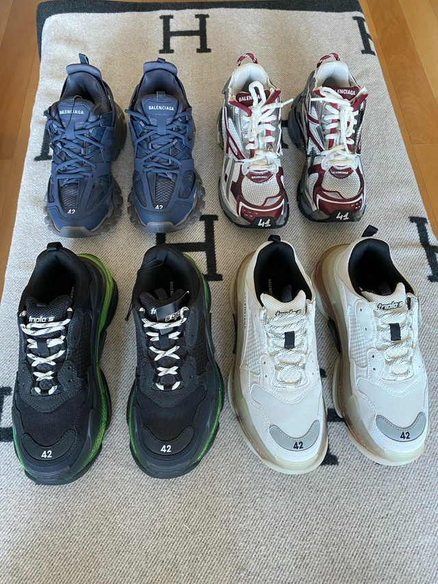 66Balenciaga Triple S Clear Sole Sneakers in black, size 42. These sneakers are in brand new never worn condition and offer a unique, modern twist on the classic Triple S design, featuring a distinctive clear sole. 100% authentic purchased on Farfetch.com, with box and receipt. Unworn Condition. Additional specs: * Size: 42( US 9 men’s ) * Colour: Black * Style: Sneaker * Sole: Clear If this ad is still up, then yes, they are still available!