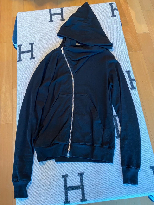 66Selling a Rick Owens DRKSHDW Black Porterville Mountain Hoodie. This stylish hoodie features a unique, asymmetrical zip and a distinctive, elongated hood, perfect for making a statement. The hoodie is in good condition, showing slight signs of wear but no significant flaws. Just like new condition. Key Features: * Brand: Rick Owens DRKSHDW * Style: Porterville Mountain Hoodie * Colour: Black * Closure: Asymmetrical zip * Hood: Elongated, pointed hood * Pockets: Two front pockets * Material: Cotton blend * Size: Small Pick up at Markham.