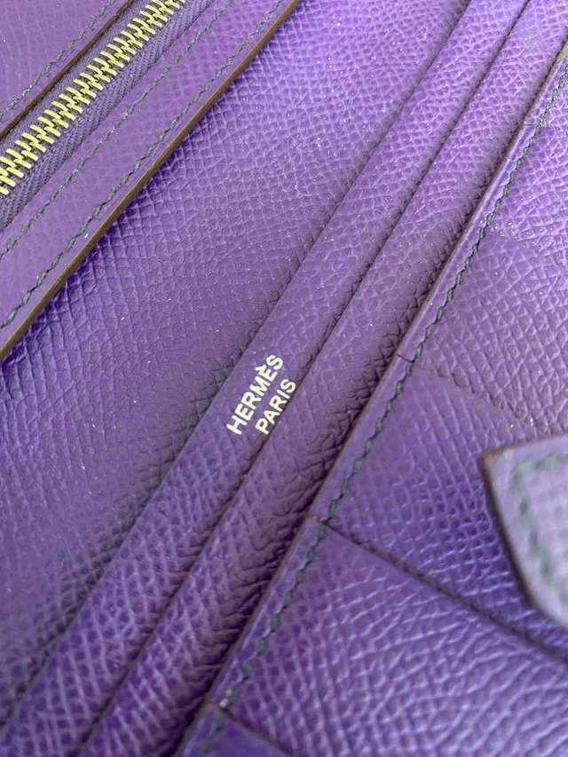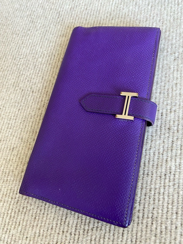 86This is a purple Hermes Bearn Wallet, a stylish and functional accessory for keeping your essentials organized. Being a previously owned item, it shows some signs of wear, which only adds to its unique character. The wallet features multiple card slots, a bill compartment, and a zippered coin pocket, all crafted with Hermes' renowned attention to detail. Wallet with gusset in Epsom calfskin Dimensions: L 17.5 x H 9 x D 0.5 cm - Leather tab with "H" closure - Zipped change purse - 5 credit card slots - 2 pockets As this product is handmade, the dimensions indicated may vary. Made in France Metallic finish: Palladium plated