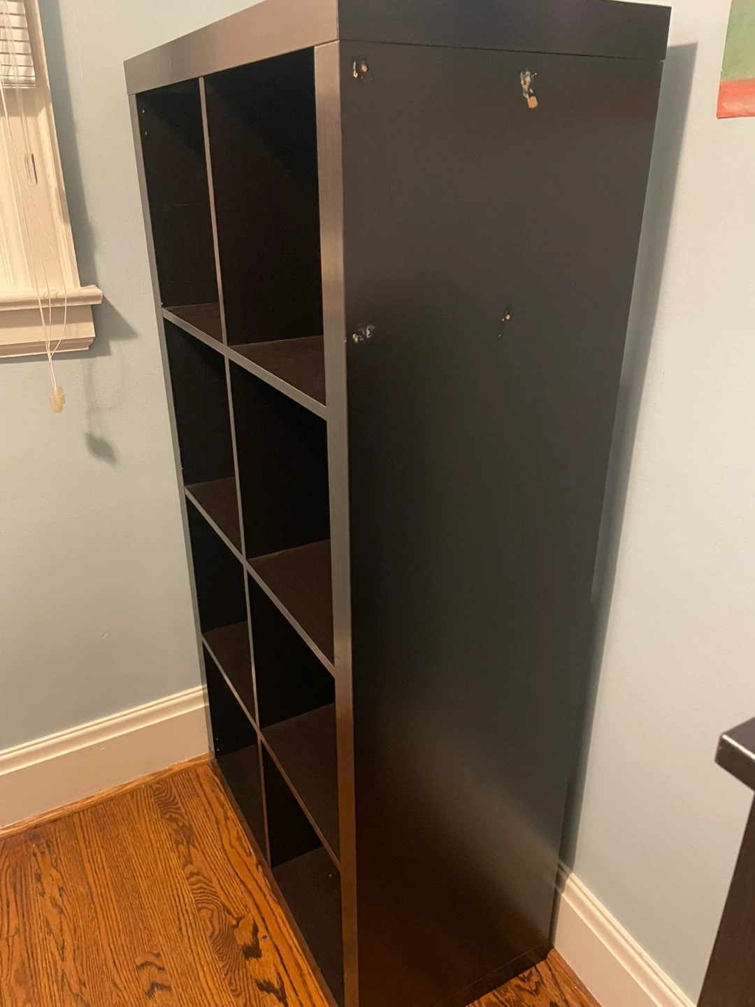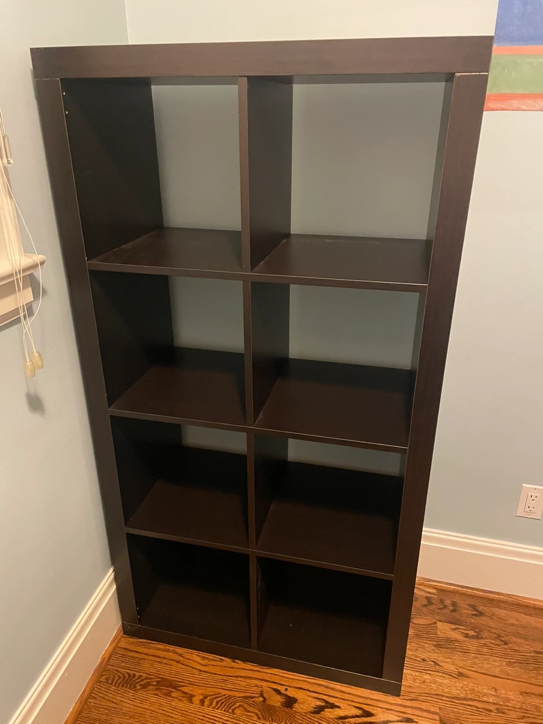 Selling a gently used IKEA Kallax shelf unit in dark brown. It's perfect for organizing books, toys, or displaying your favourite items. This unit has 8 compartments, providing ample storage space. It's in great condition and ready for a new home!