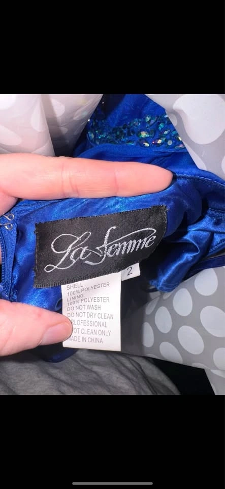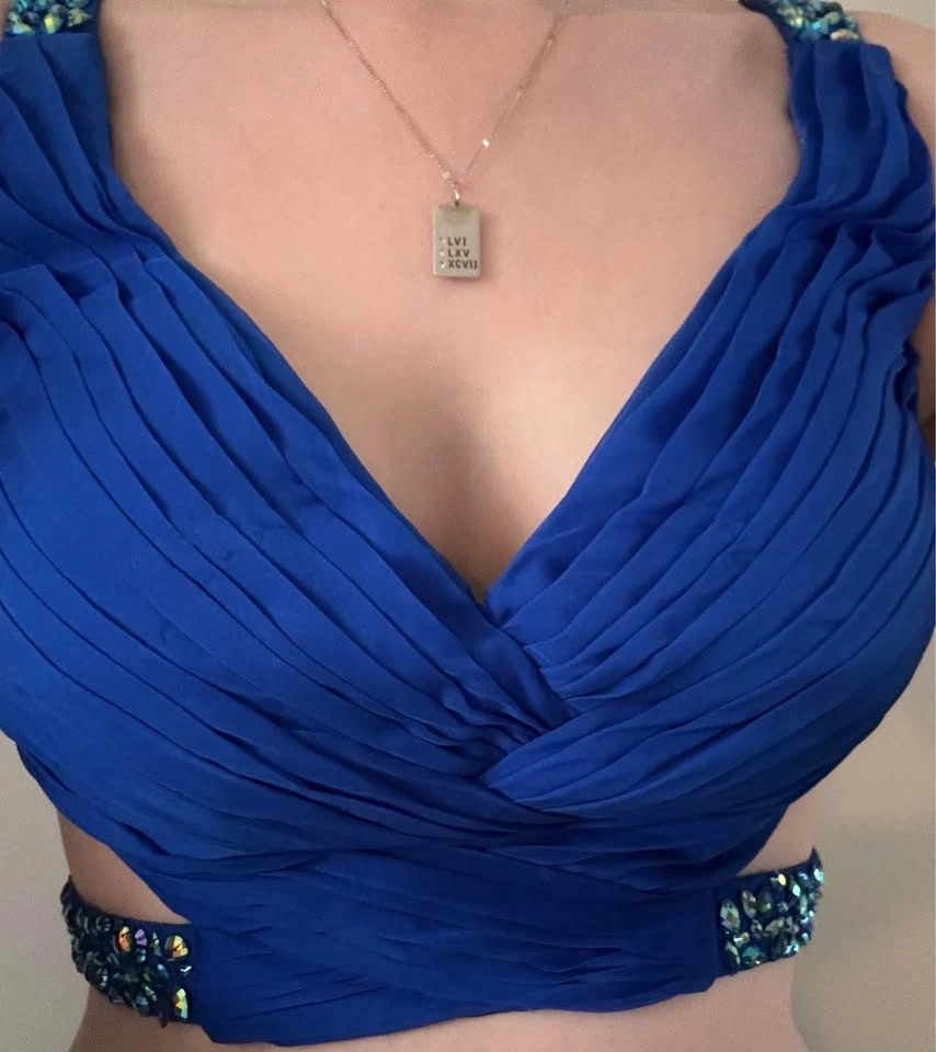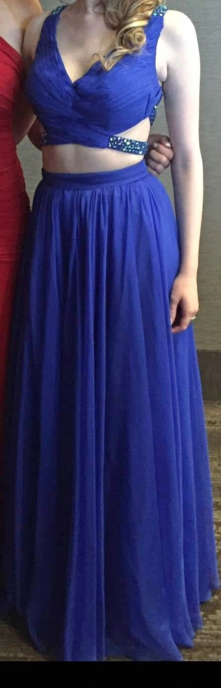 26Used once, 2 piece royal blue prom dress. Open back with sparkles. Top - 34 C cup size 26-28” ribs Skirt- 44” Long 26” waist This is a size 2 dress with small adjustments made. 5’3” wearing 4”/5” heels.