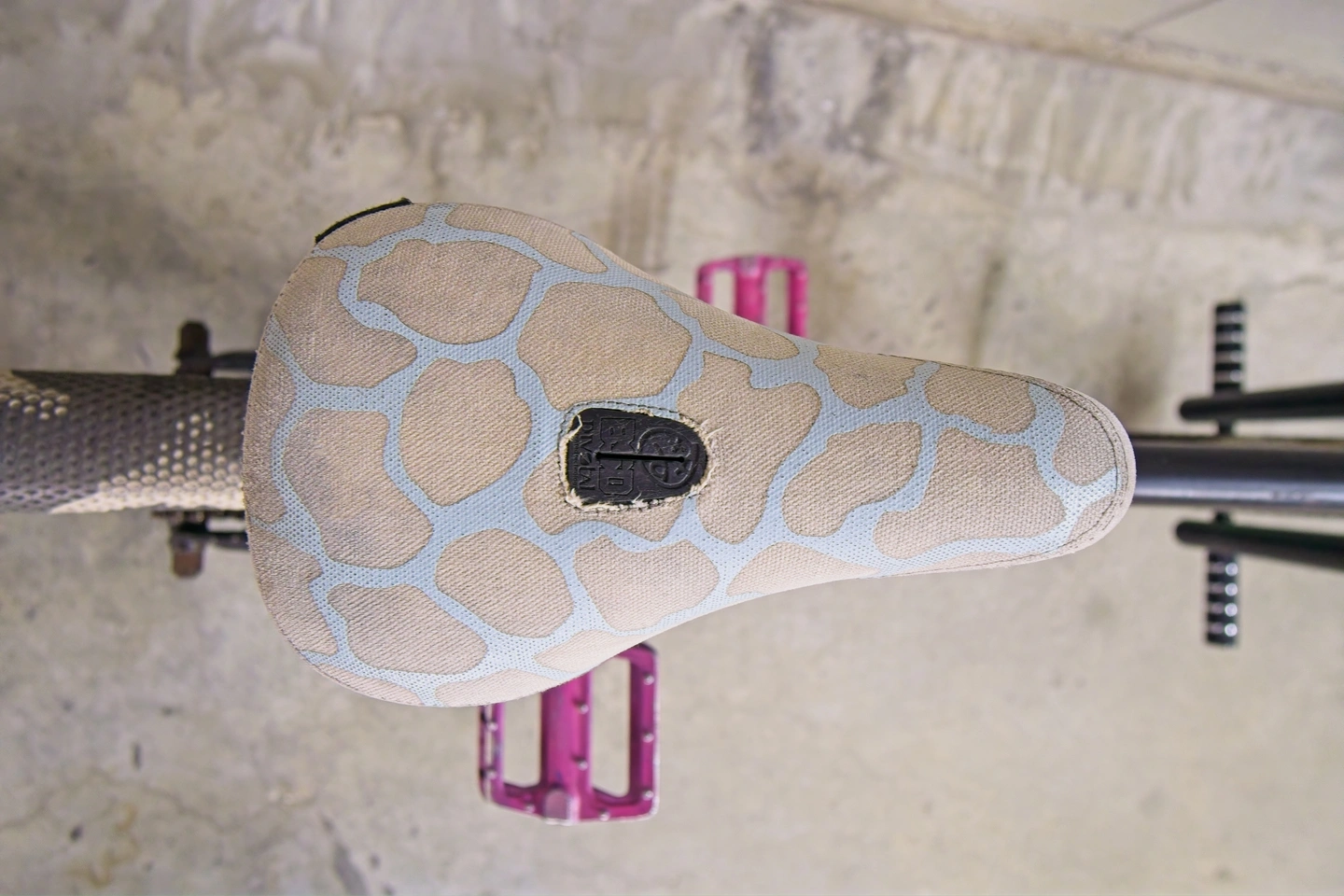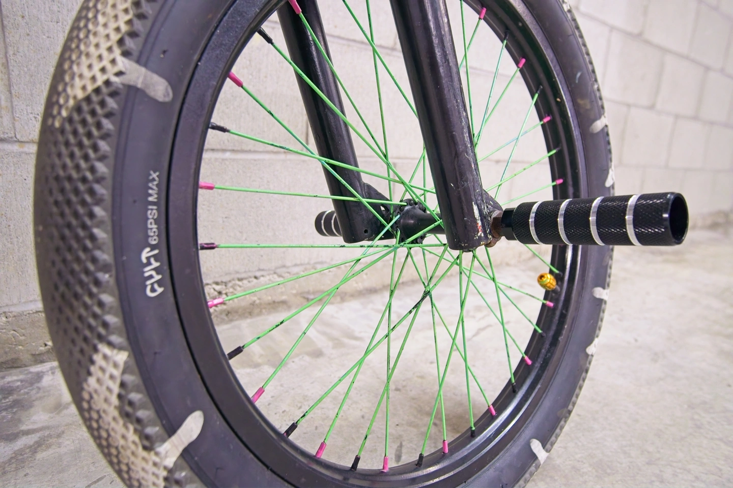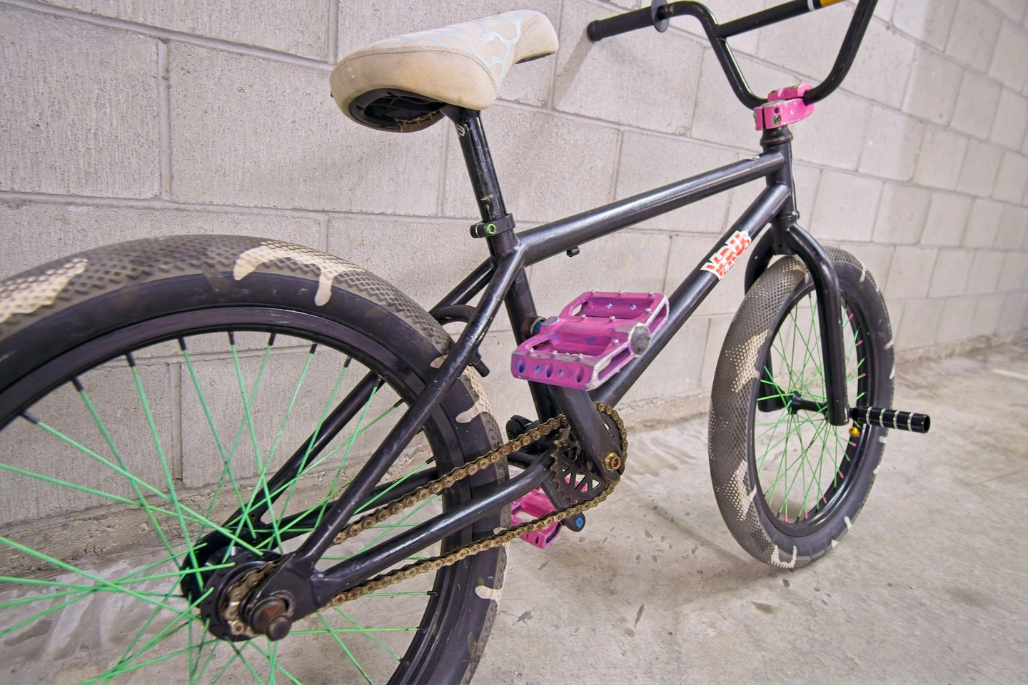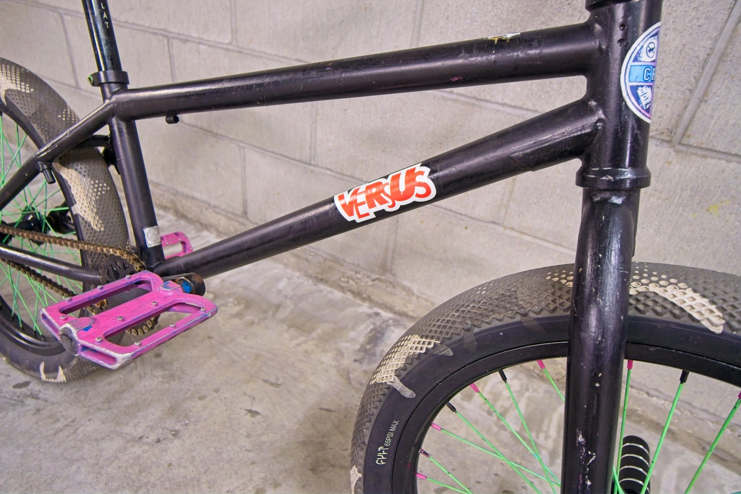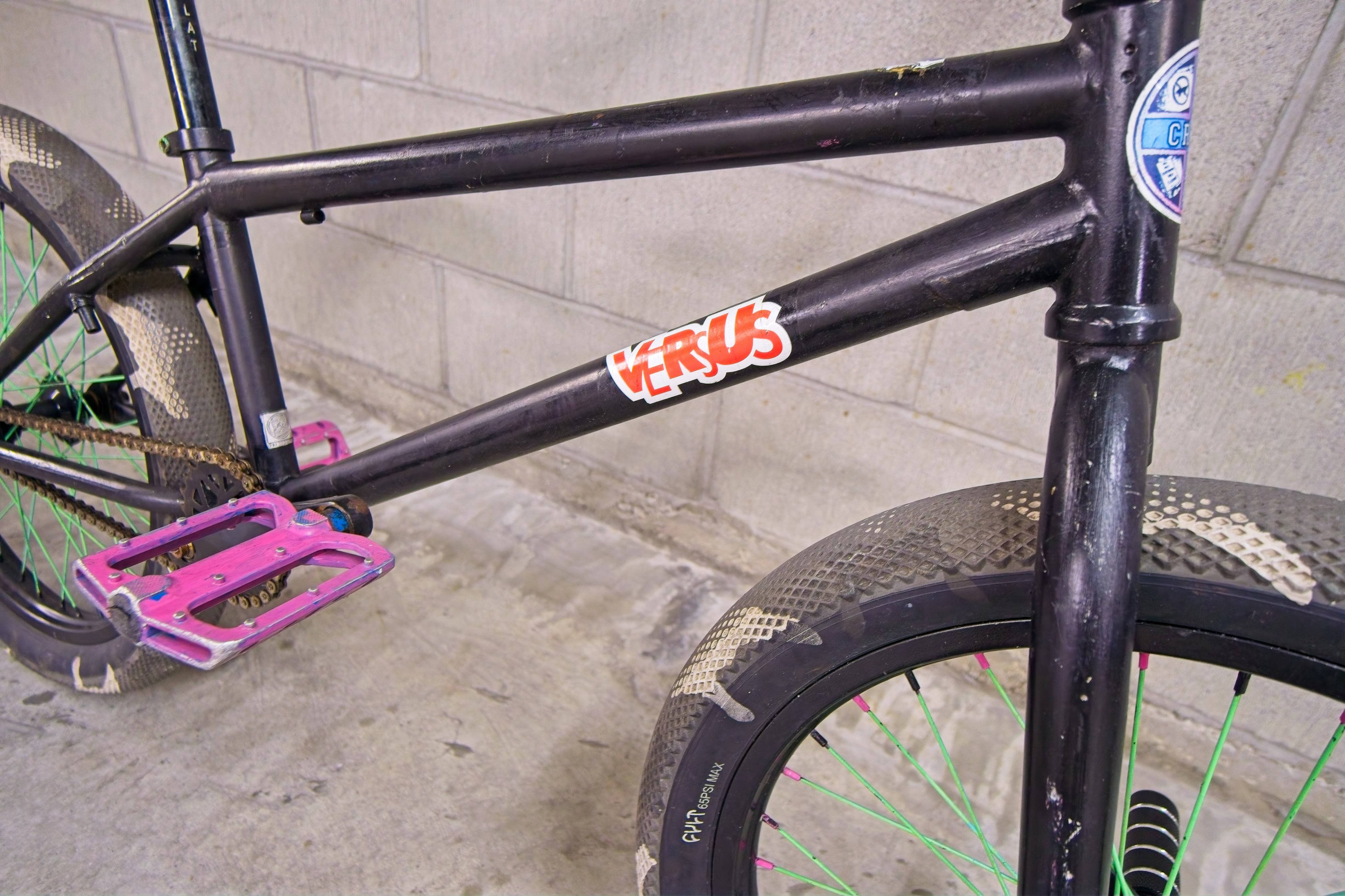 Up for sale is a custom-built BMX freestyle bike featuring a solid Versus frame with unique color highlights. This bike has a tough black frame, neon green spokes, pink stem and pedals, and a beige patterned seat — giving it a standout look perfect for park, street, or dirt riding.