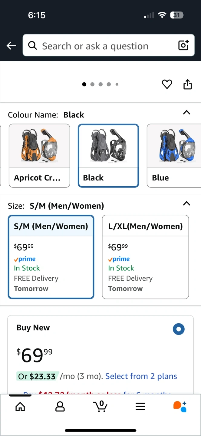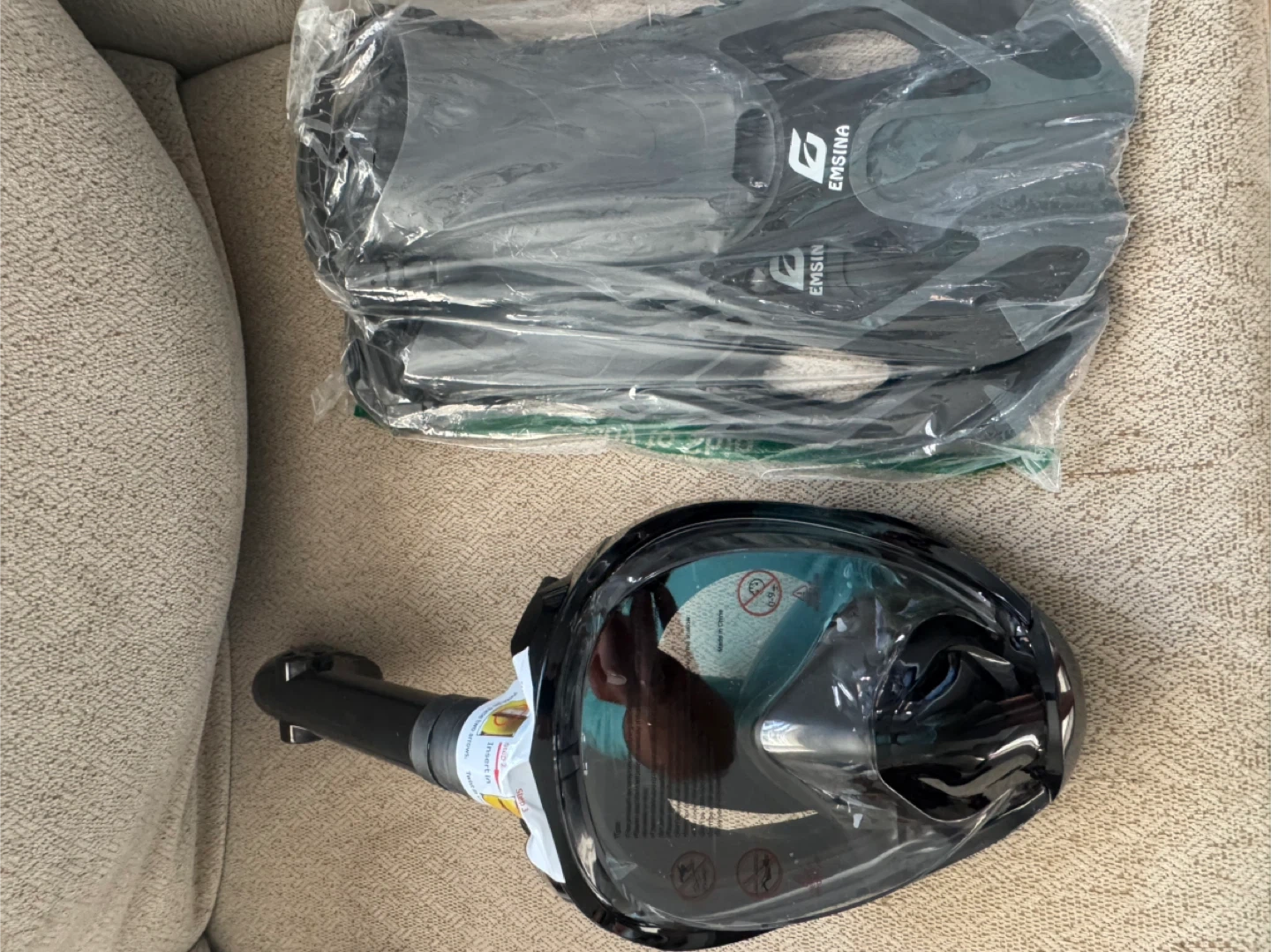 Selling a black Emsina full face snorkel mask in size S/M. It's designed for adults and kids, featuring a dry top breathing system and a foldable panoramic view. It also has anti-leak and fog-tech features for a clear underwater experience