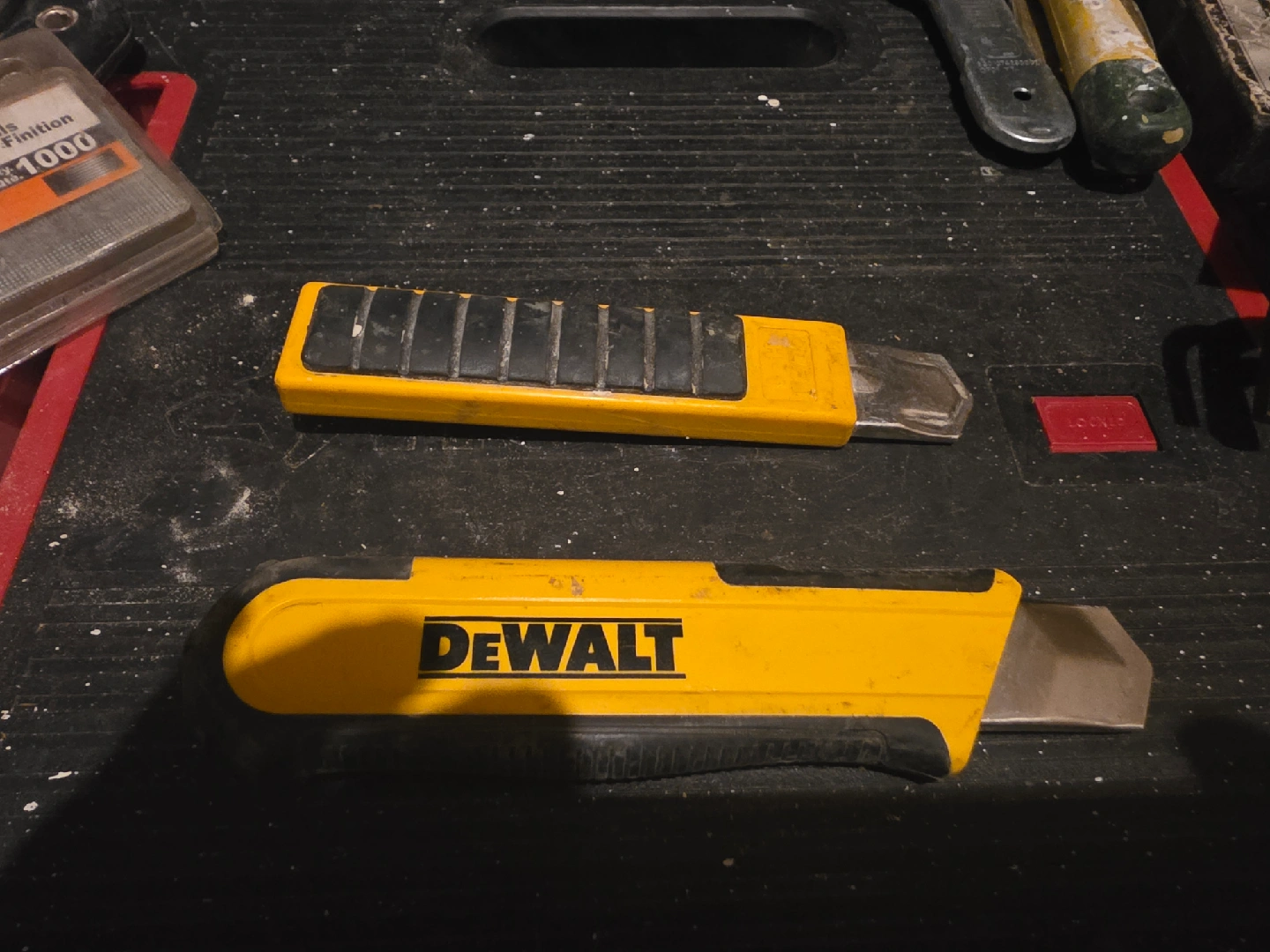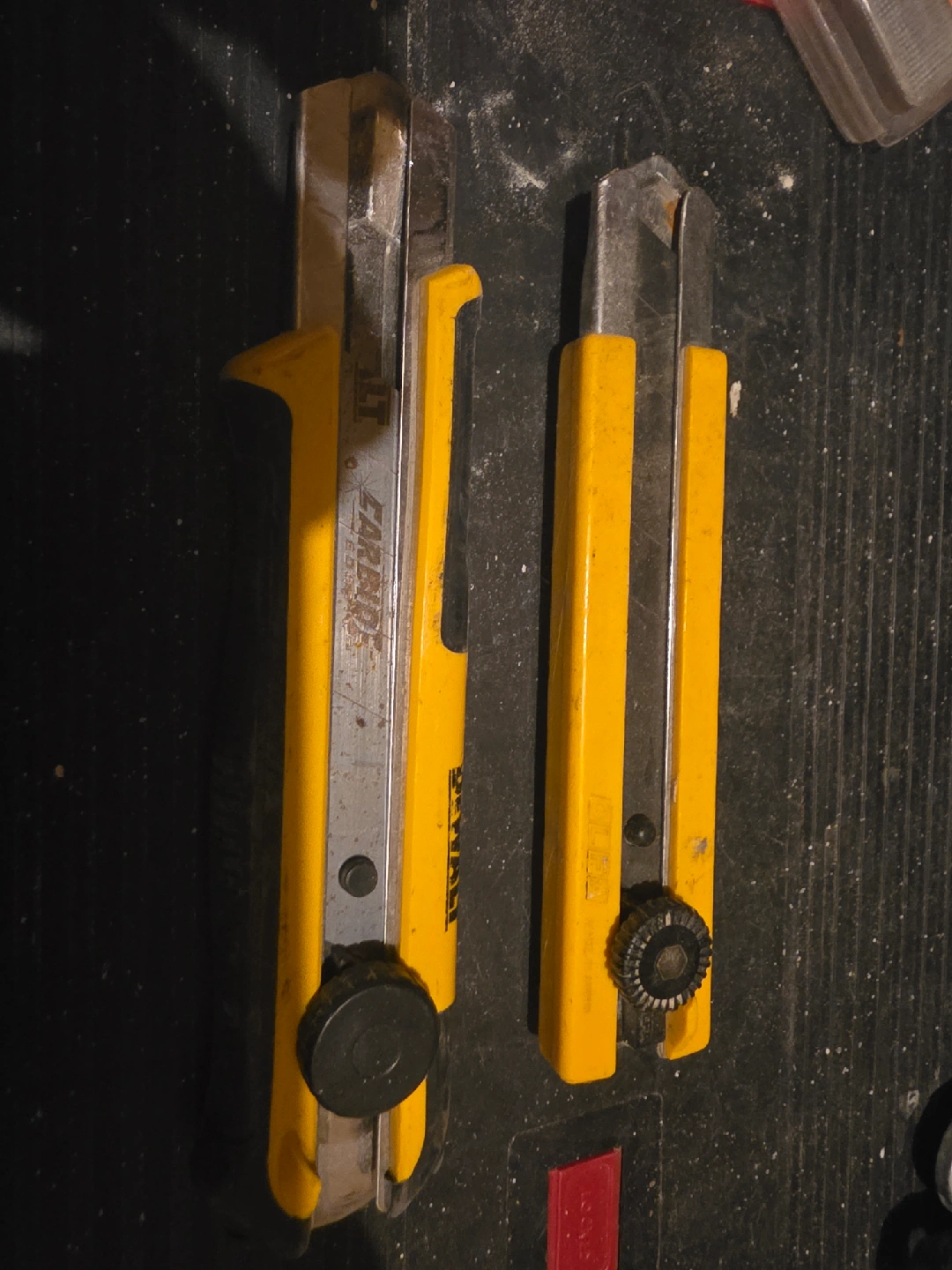 59Selling two used utility knives. One is a Dewalt, and the other is a Carbide Edge. Both are in used condition, with signs of wear from use.