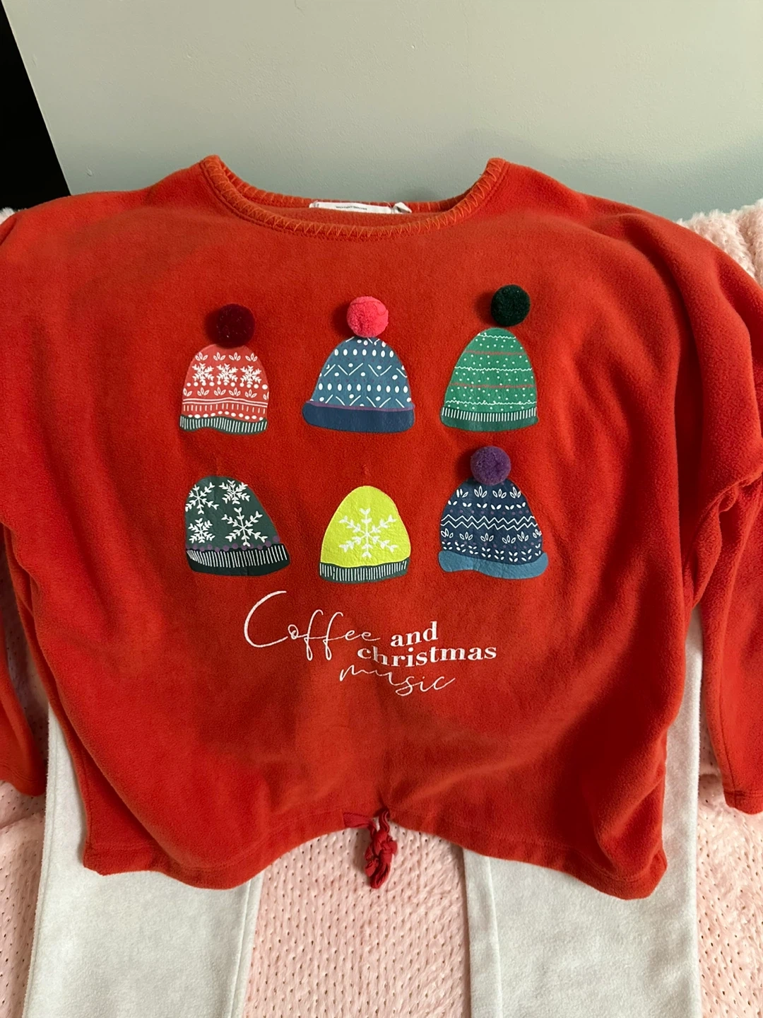 Here's a cute Women'secret red Christmas sweater! It's a size small and features a fun design with colourful hats and the words 'Coffee and Christmas music'