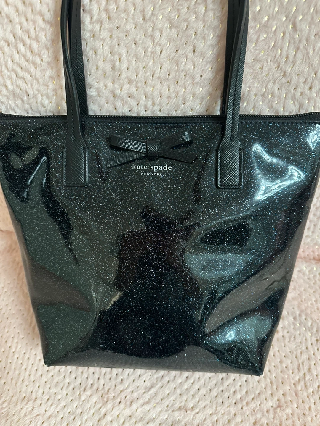 Selling a Kate Spade tote bag in black glitter. It's in great condition and perfect for adding a bit of sparkle to your day!