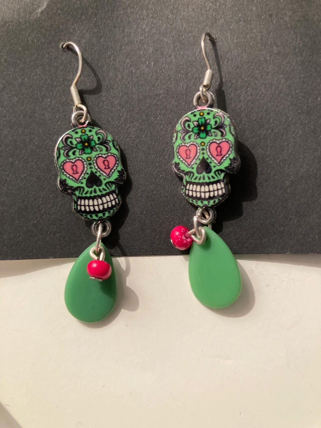 186Cute sugar skull earrings with a dangle design! These earrings feature a green skull with heart-shaped eyes and a green teardrop dangle with a small red bead accent. Perfect for adding a bit of fun to your outfit