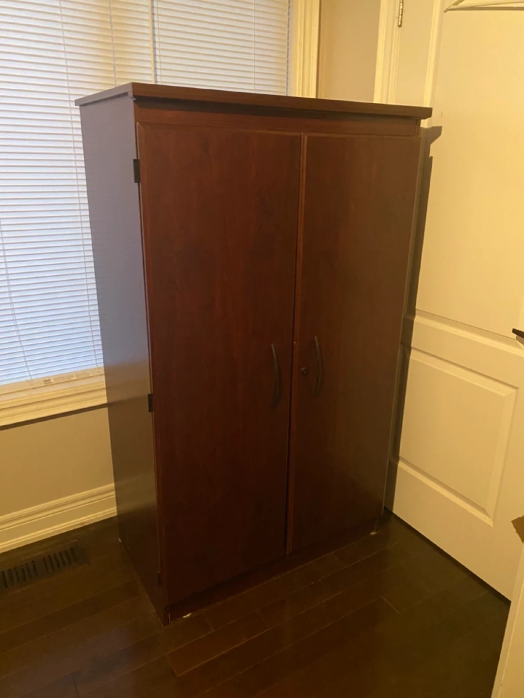 Selling a dark brown wardrobe cabinet. It has two doors and interior shelves for storage. It's in good condition and perfect for organizing your clothes and other items.
