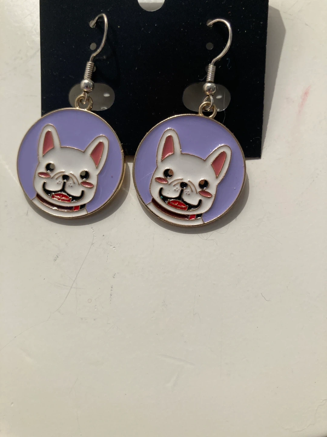 186These are super cute dog face earrings! They feature a white dog with pink ears on a light purple background. They're perfect for adding a bit of fun to any outfit! Sterling Silver posts