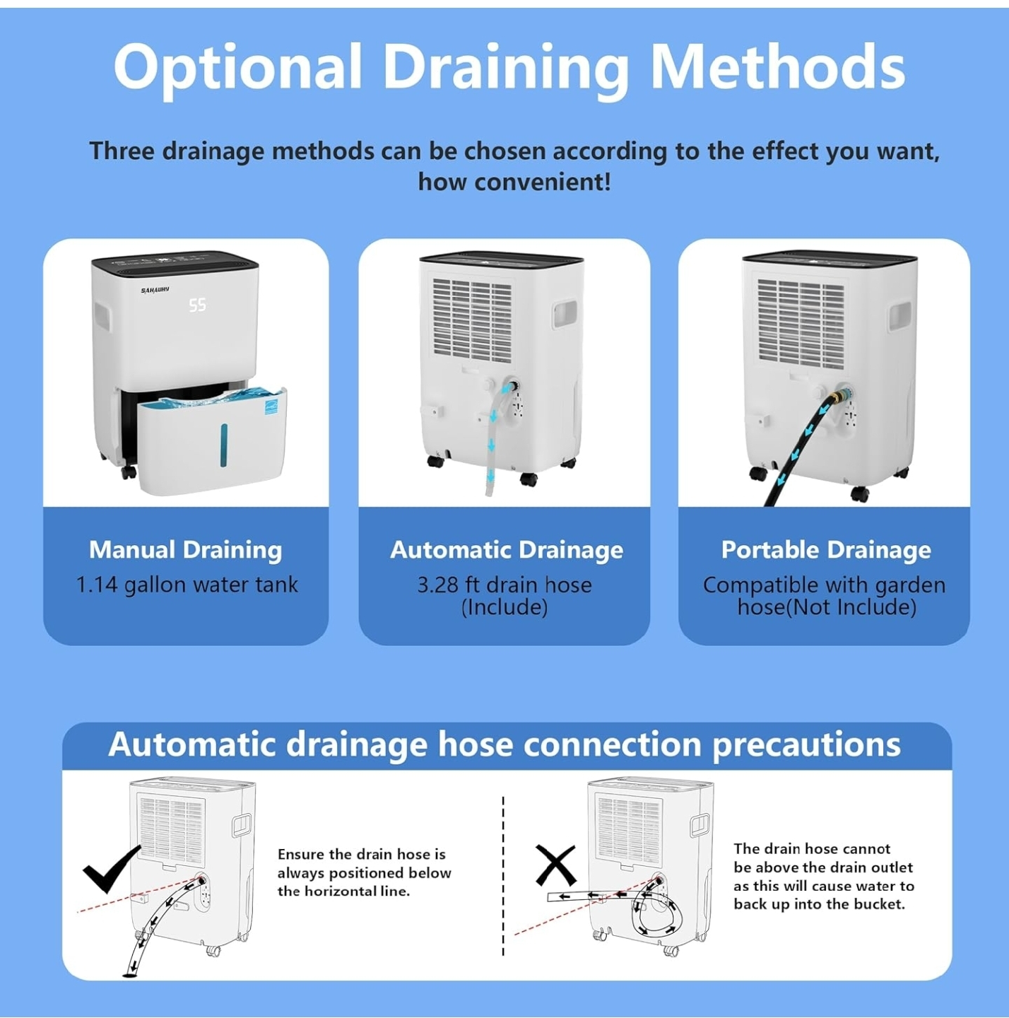 This SAHAUHY dehumidifier can handle spaces up to 5,200 sq ft and removes up to 80 pints of moisture per day. It features high-efficiency refrigerant technology and a copper heat exchange tube. The unit also offers optional draining methods, including manual draining with a 1.14-gallon water tank, automatic drainage with a 3.28 ft drain hose, and portable drainage compatible with a garden hose. It also features a touch control button and four fan speeds