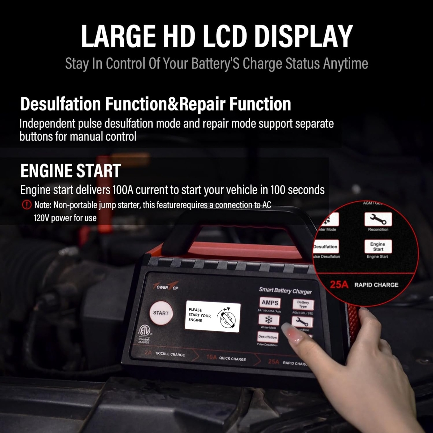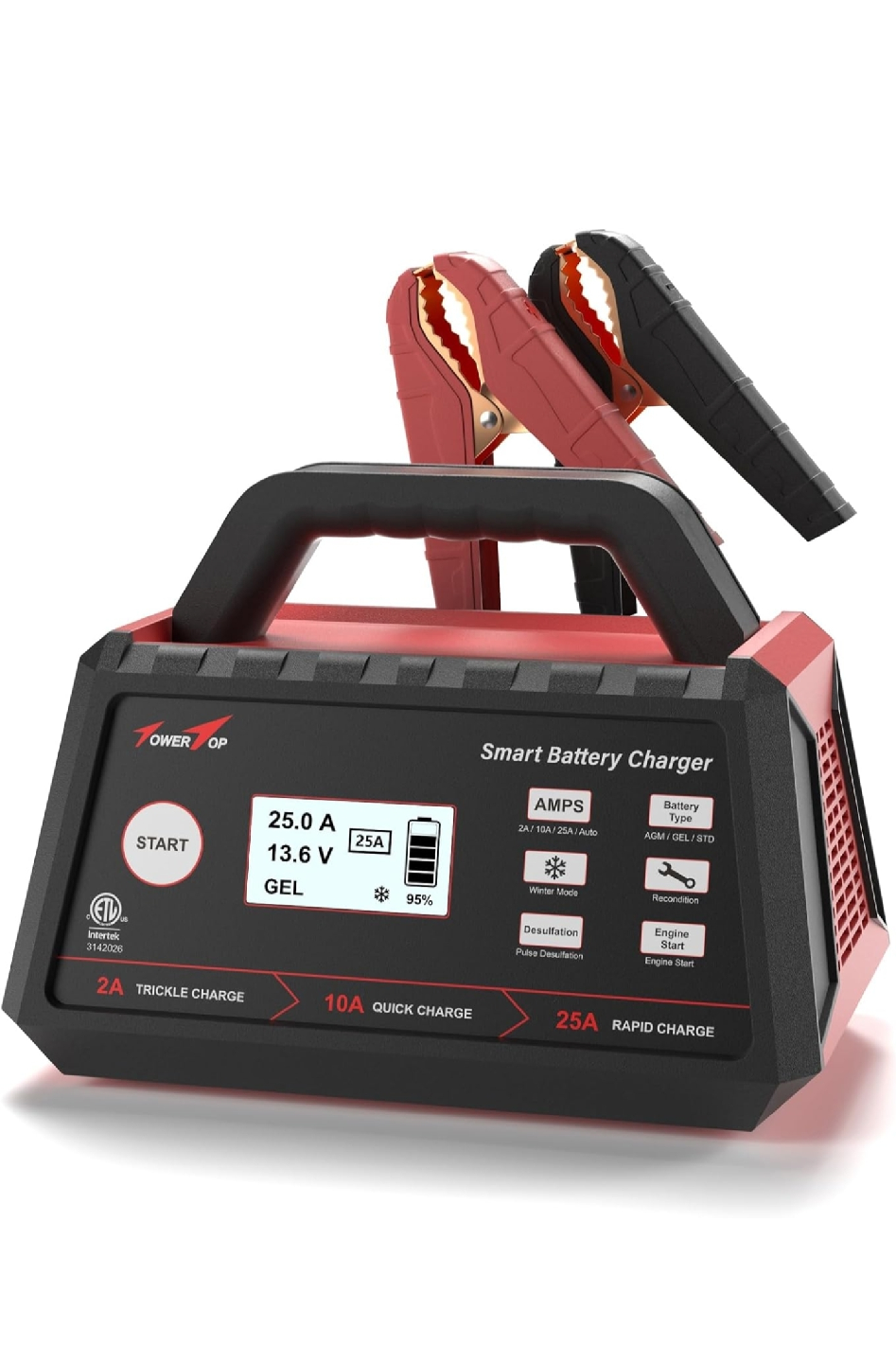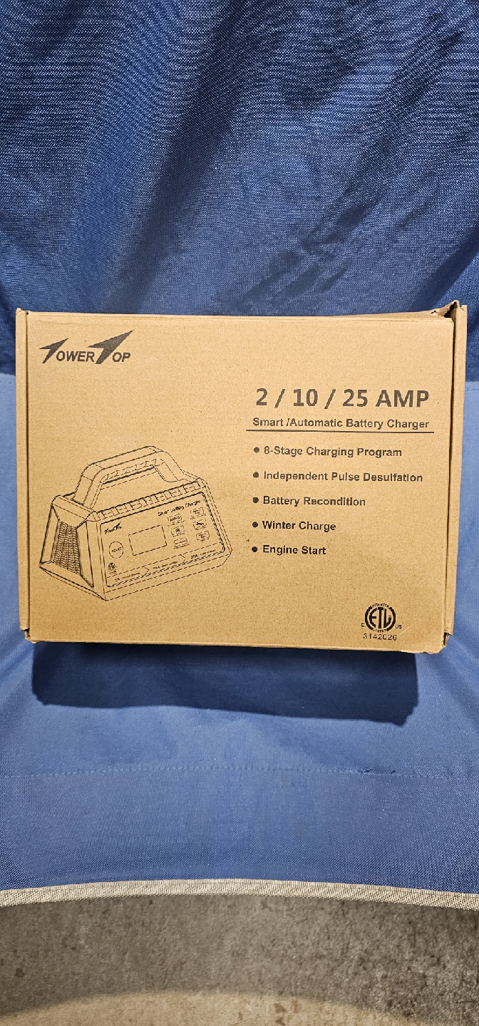 I'm selling a TowerTop Max 25 Amp smart battery charger! It's designed to work with 12V STD AGM GEL batteries. It has a large HD LCD display to show your battery's charge status. It also features desulfation and repair functions, with independent pulse desulfation mode and repair mode support with separate buttons for manual control. It can also engine start and delivers 100A current to start your vehicle in 100 seconds