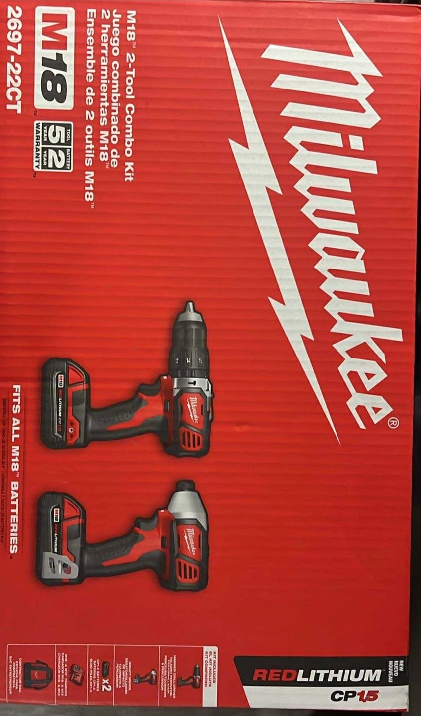 Selling a Milwaukee M18 2-Tool Combo Kit. It includes a hammer drill/driver, impact driver, two CP1.5 batteries, an M18 & M12 charger, and a contractor bag.