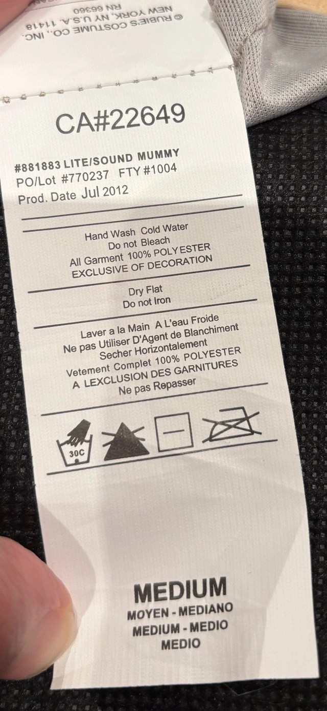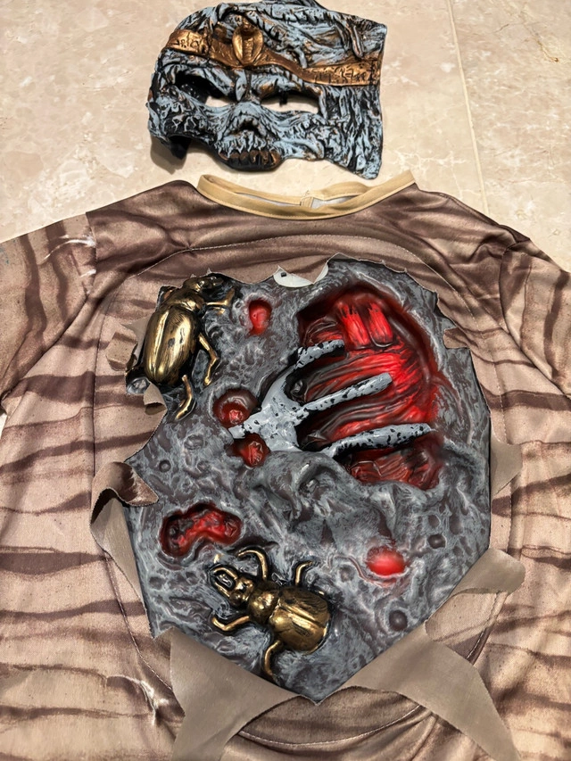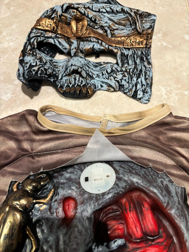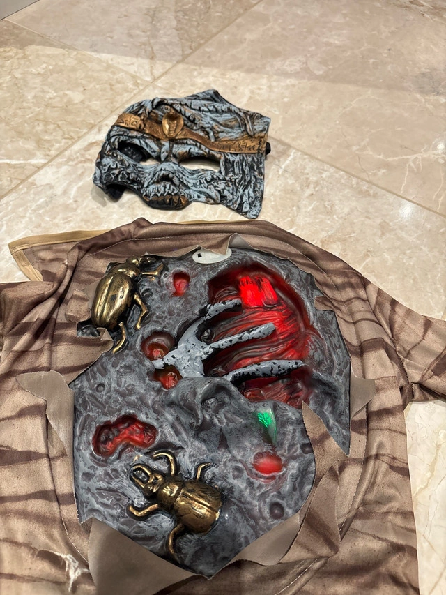 Mummy Halloween costume with a chest plate that lights up and makes a heartbeat sound. Works perfectly well and comes with the batteries.