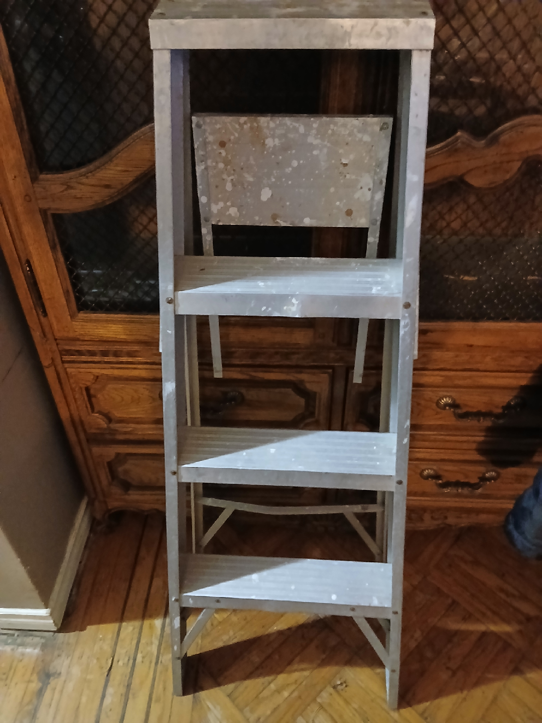 Selling a used aluminum step ladder. It has some signs of use, as pictured, but is still sturdy and functional. Perfect for household tasks or DIY projects!