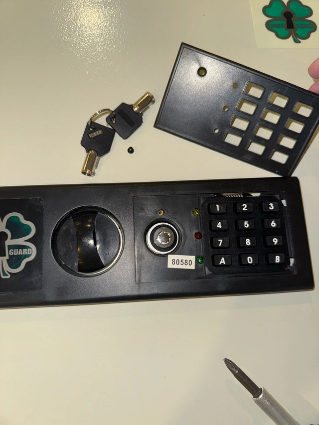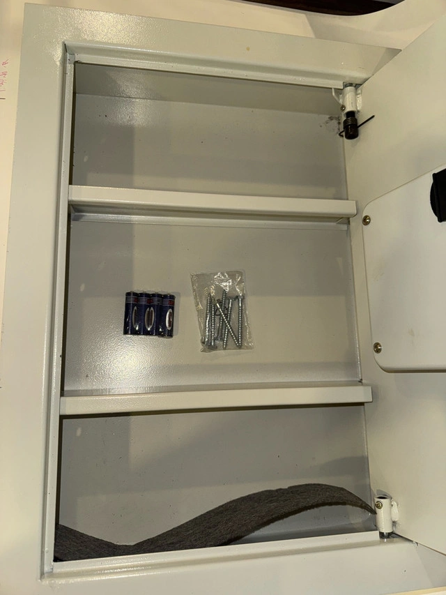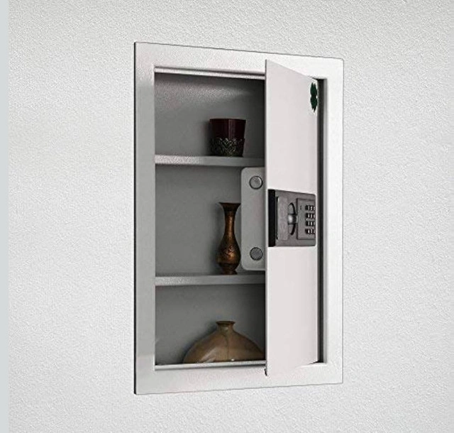 10This is a brand new Lucky Guard Electronic Wall Safe, designed for securing valuables in a concealed location. Features digital entry with a programmable PIN code (3 to 8 numbers) and comes with two keys for alternative access. It has a flat panel design for easy concealment, fitting between wall studs. Made of solid steel with tamper-proof hinges and pre-drilled holes for anchoring. Runs on AA batteries (included). Ideal for securing jewelry and other valuables in homes, offices, or vacation homes.