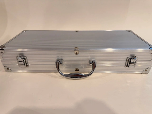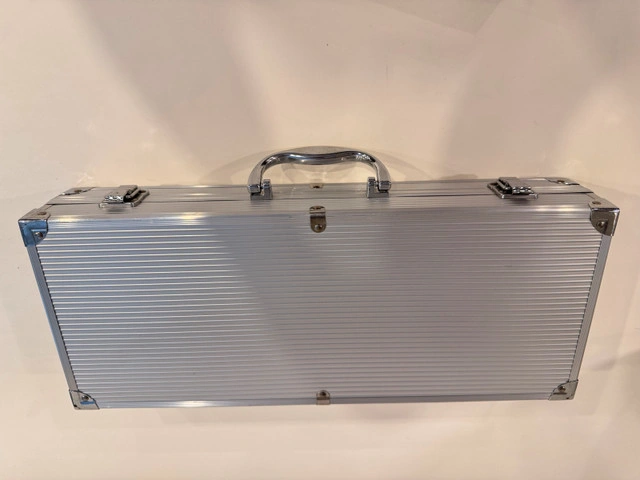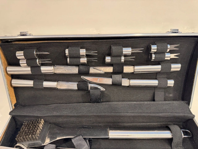 10Brand new stainless steel BBQ cooking set with carrying case for sale. Complete with essential grilling tools, perfect for backyard barbecues, camping trips, or tailgating. Made from durable stainless steel for long-lasting performance and easy cleaning. Ergonomic handles provide comfort and control while cooking. Still unused and in original packaging, making it a great gift for grill enthusiasts. Serious buyers only