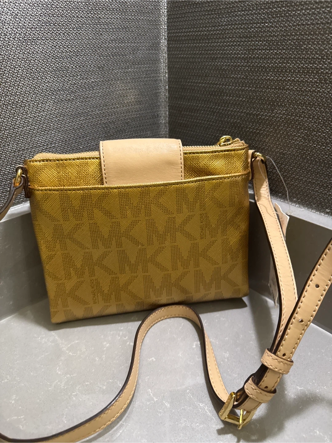 Selling a cute Michael Kors crossbody bag in gold! It's brand new and perfect for everyday use or a night out. The bag features the MK logo pattern and has a convenient crossbody strap. Very versatile for a fashionably female.