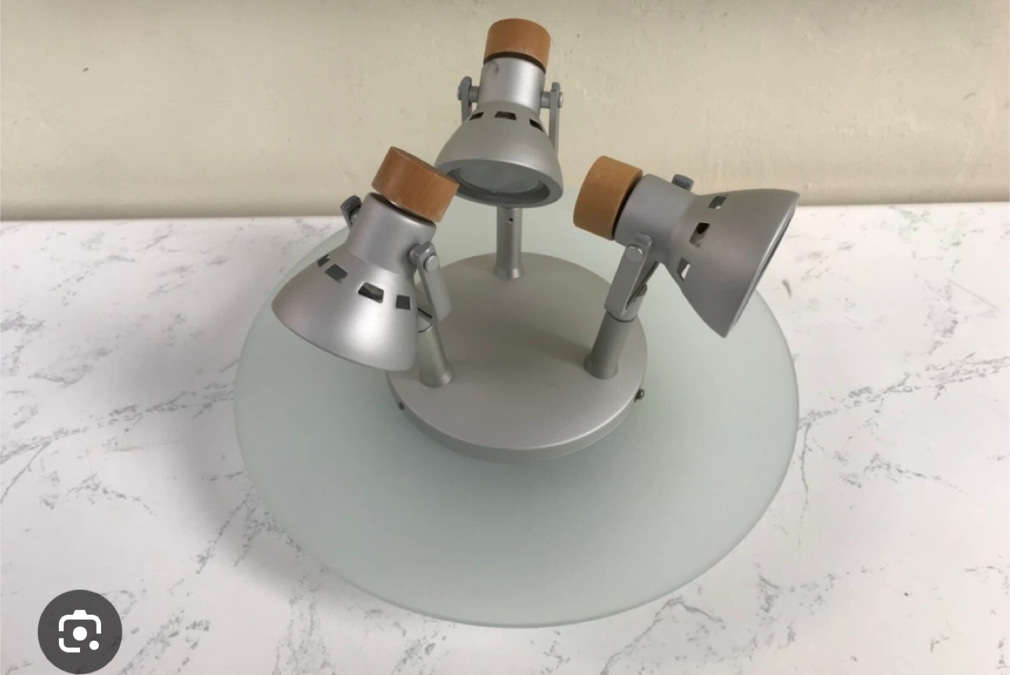 Here's a spotlight ceiling light with three adjustable spotlights. It has a silver finish and a frosted glass base. It's in great condition and ready to brighten up your space!