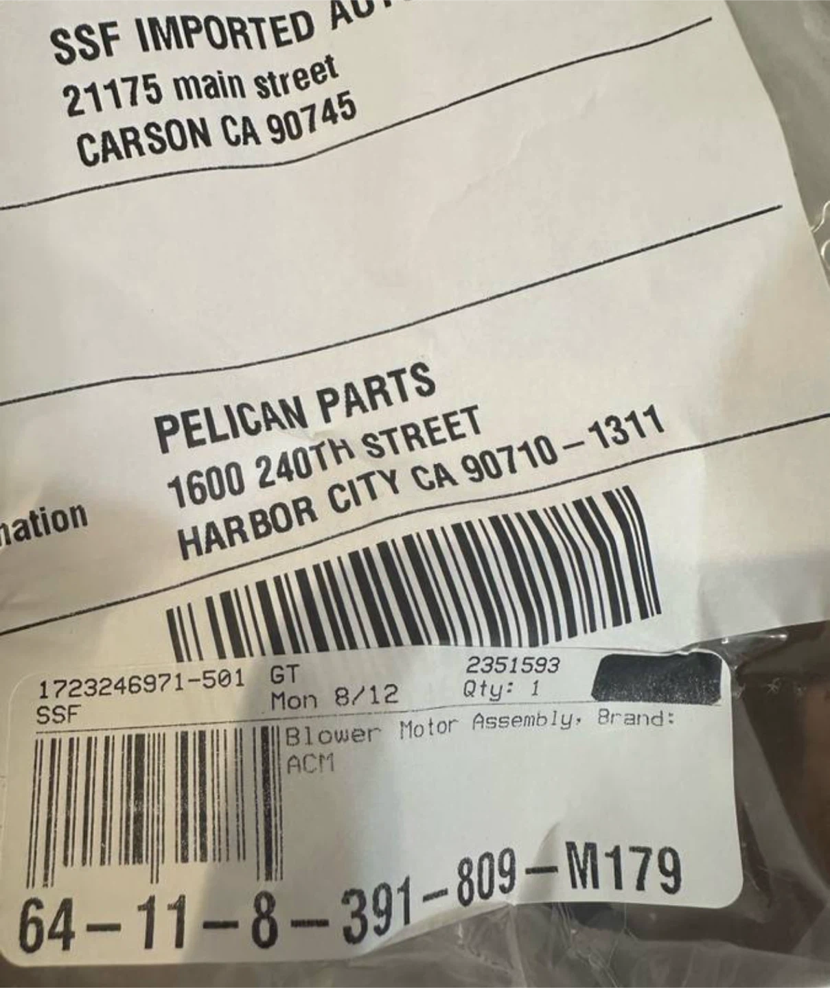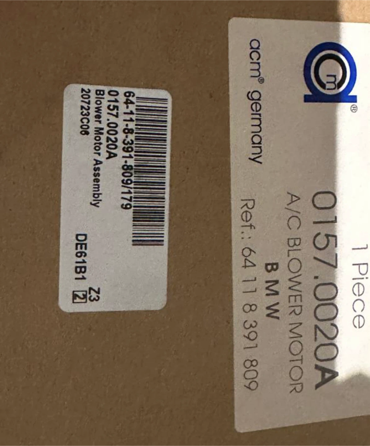 55Selling a BMW A/C blower motor assembly. The brand is ACM and the part number is 0157.0020A. This is a blower motor assembly for a BMW. The reference number is 64 11 8 391 809. It comes in its original box! NEW