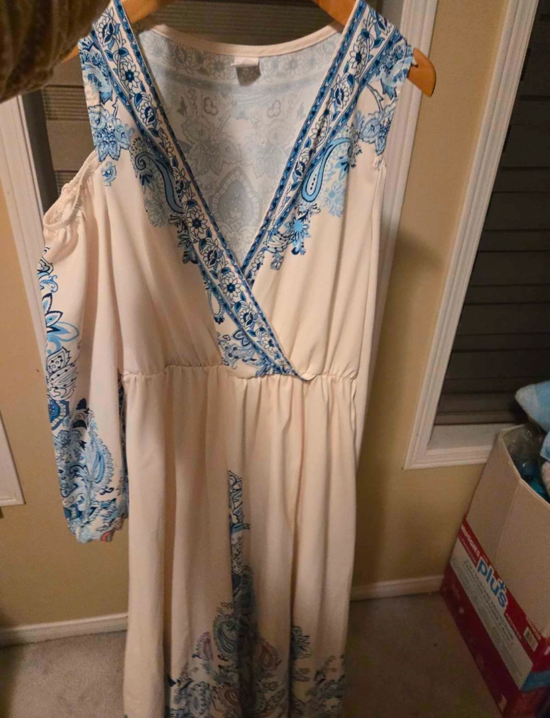 Here's a lovely maxi dress featuring a cream base with a beautiful blue paisley pattern! It has a flattering V-neck and a comfortable, flowy fit. Perfect for a summer day or a casual evening out