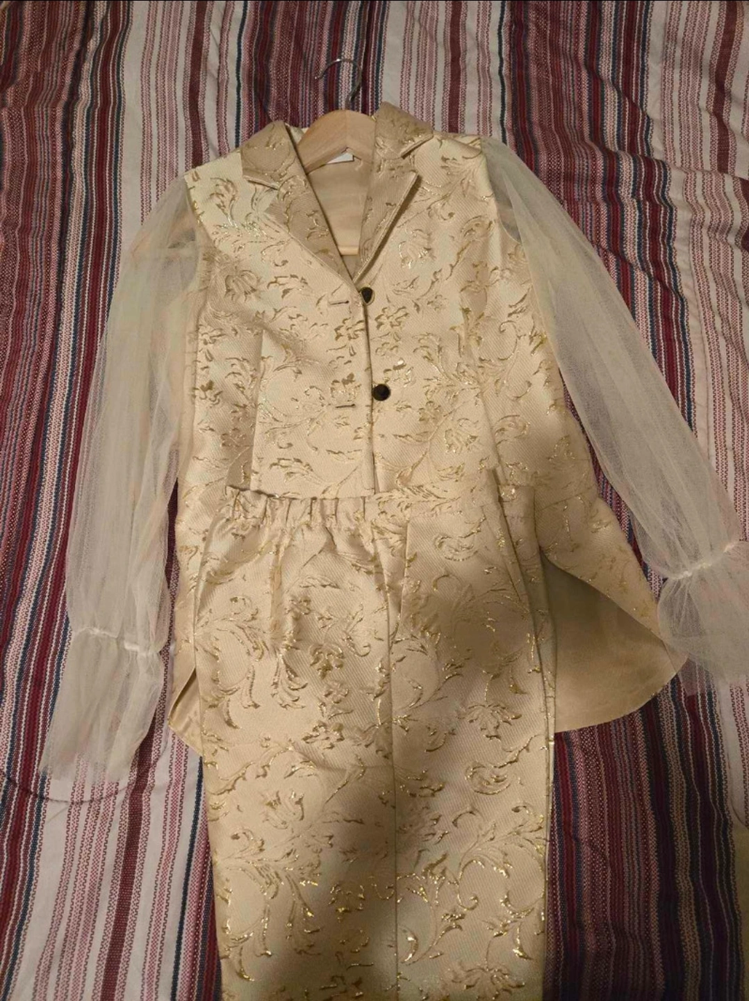 10A stylish gold floral blazer and pants set. The blazer features a two-button closure and sheer sleeves, adding a unique touch. The pants have an elastic waistband for a comfortable fit. Perfect for a special occasion or a night out!