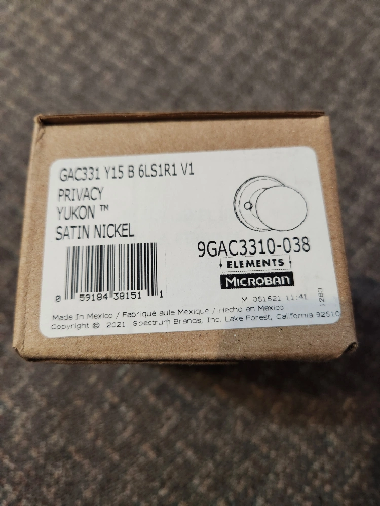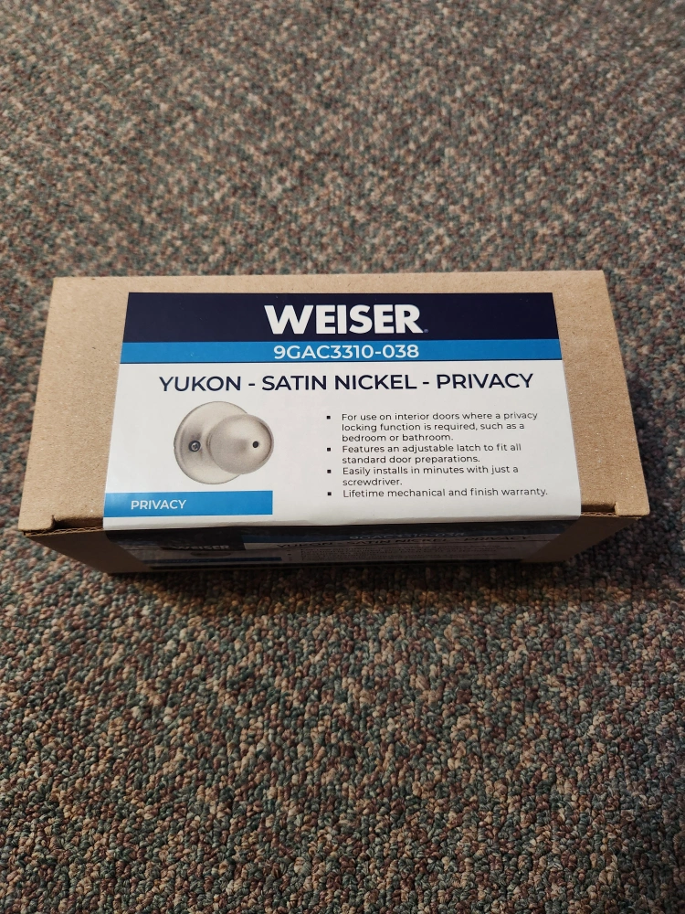 Selling a brand new Weiser Yukon privacy knob in satin nickel! It's still in its original packaging. Features: - For use on interior doors where a privacy locking function is required - Adjustable latch to fit all standard door preparations - Easy install with just a screwdriver - Lifetime mechanical and finish warranty