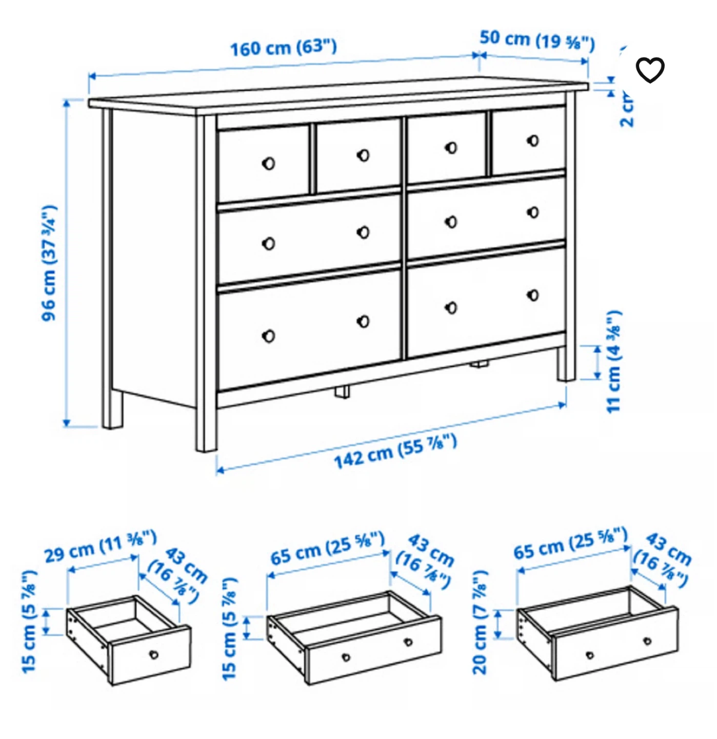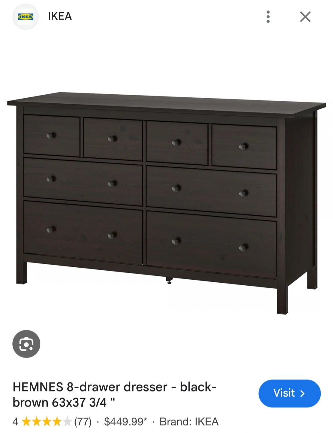 Selling an IKEA Hemnes 8-drawer dresser in black-brown! It's in great shape and ready for a new home. The dimensions are 63x37 3/4 ". This dresser offers ample storage with its eight drawers minor scratch