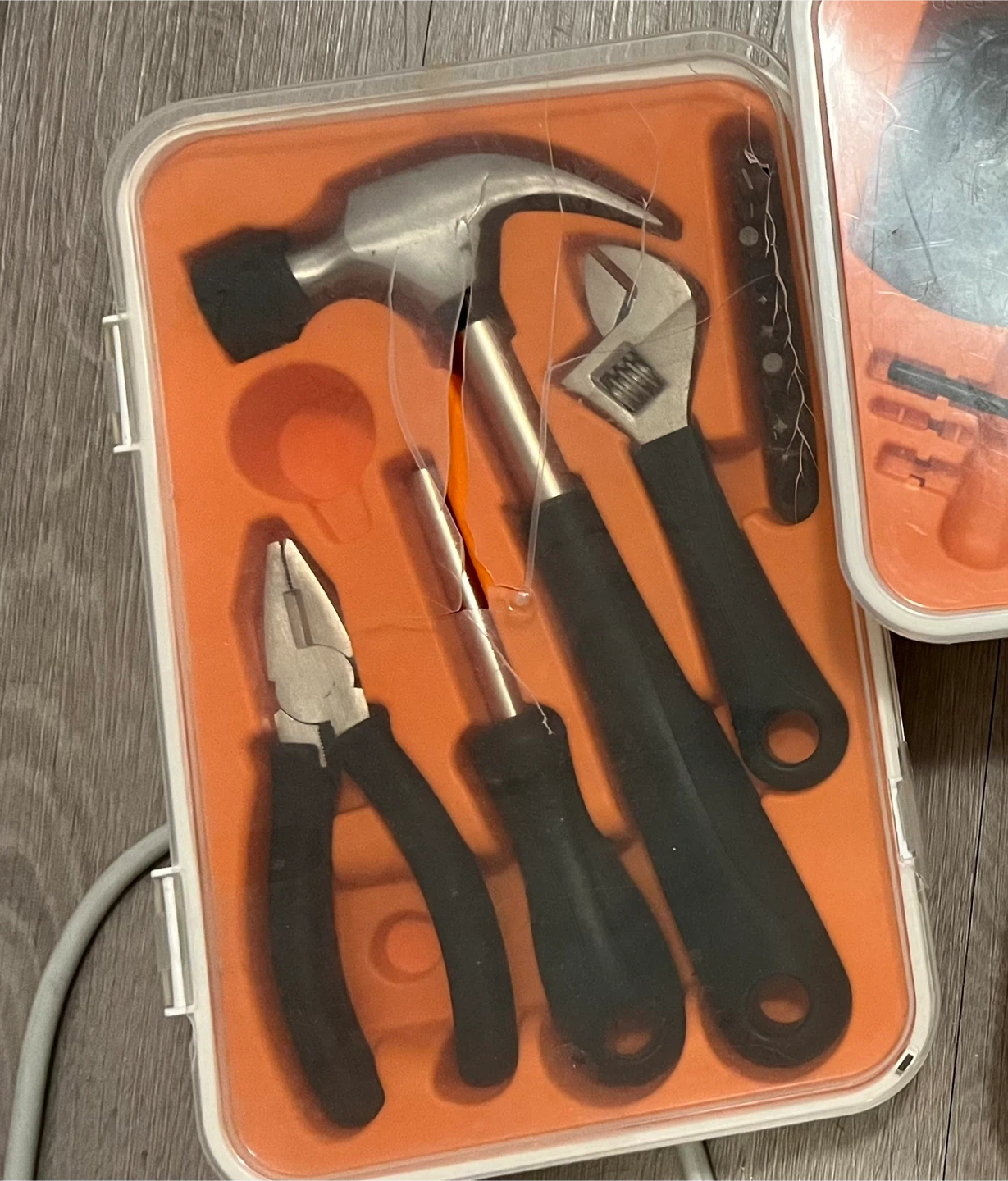 Selling a IKEA handy tool set that includes a hammer, pliers, and a screwdriver! It comes in a convenient orange case. missing 2 bits.