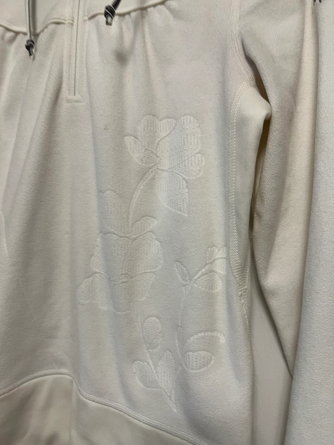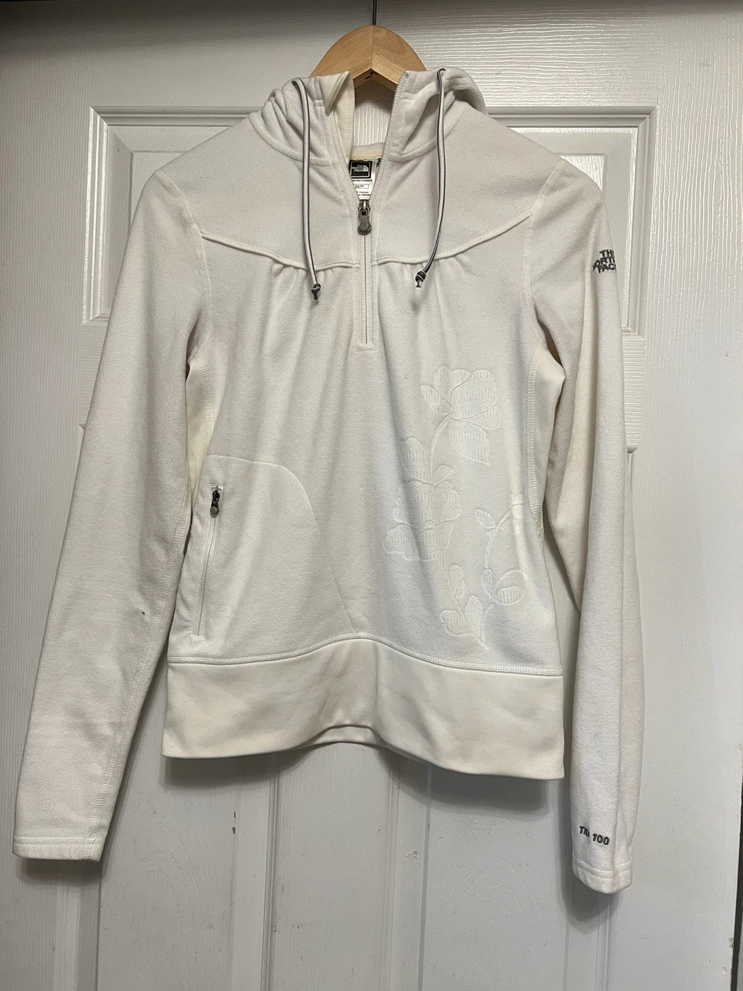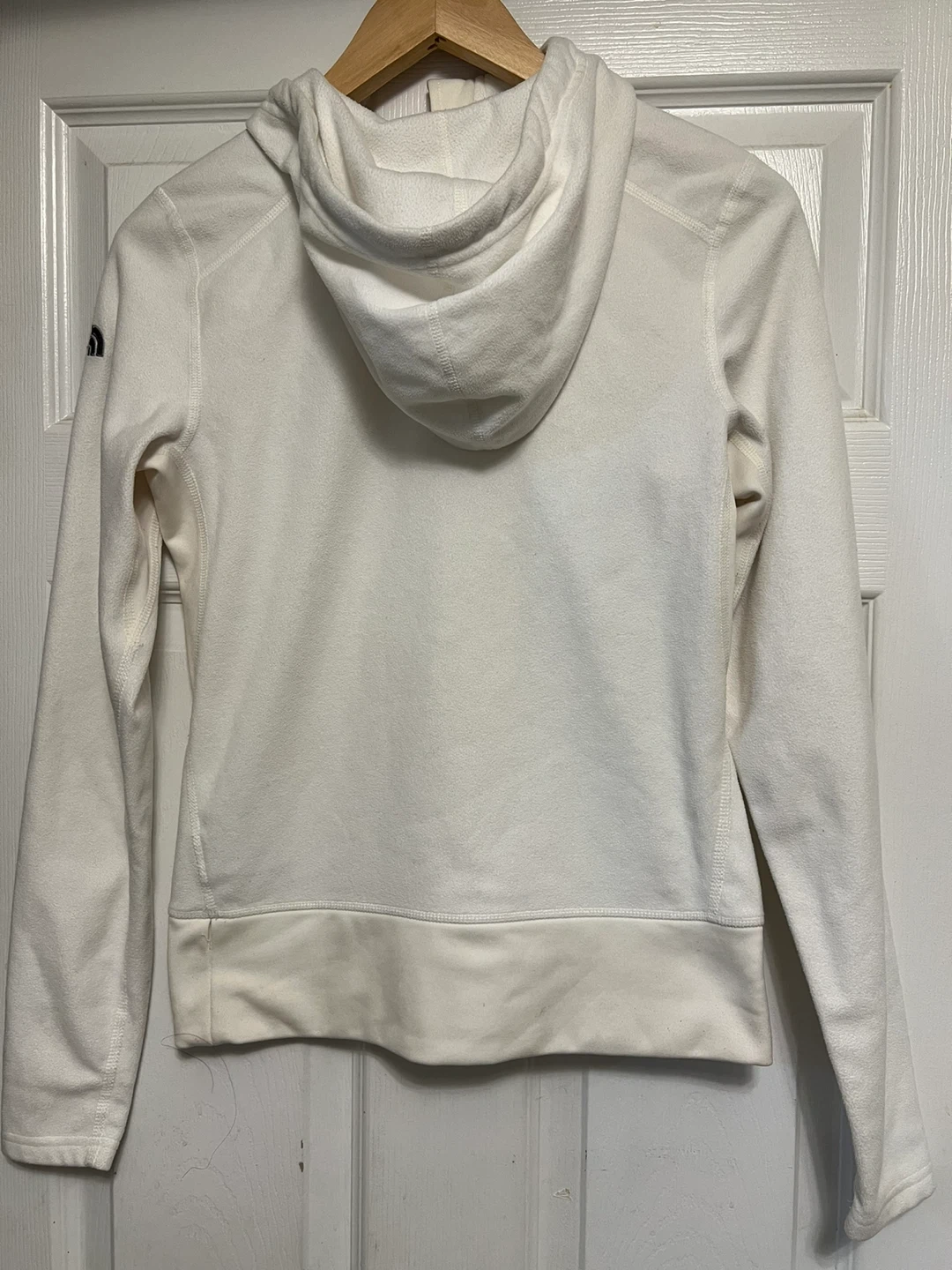 Cozy up in this The North Face fleece hoodie! It's a women's size XS and features a quarter-zip design and a hood. The soft, white fleece material is perfect for staying warm on chilly days.
