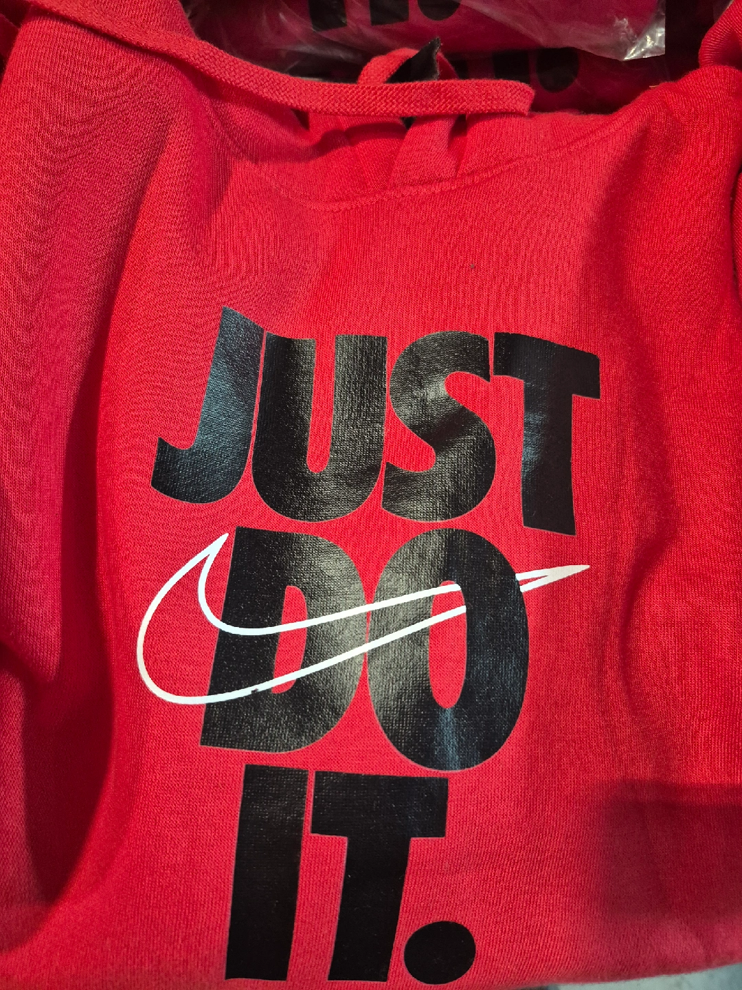 10Selling a Nike hoodie in red with the iconic "Just Do It" logo. It's in great condition and ready for a new home! Perfect for staying cozy and stylish. These are overstock and come in all sizes Mens xl mens s mens M mens lg fit women too.