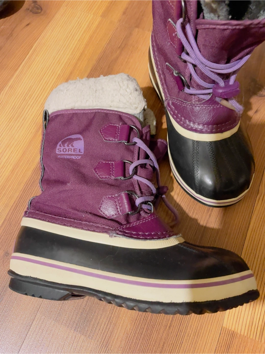 76These are a pair of Sorel waterproof winter boots. They are purple and black, perfect for keeping your feet warm and dry in the snow! The boots are in good condition and ready for a new home Kids size 3