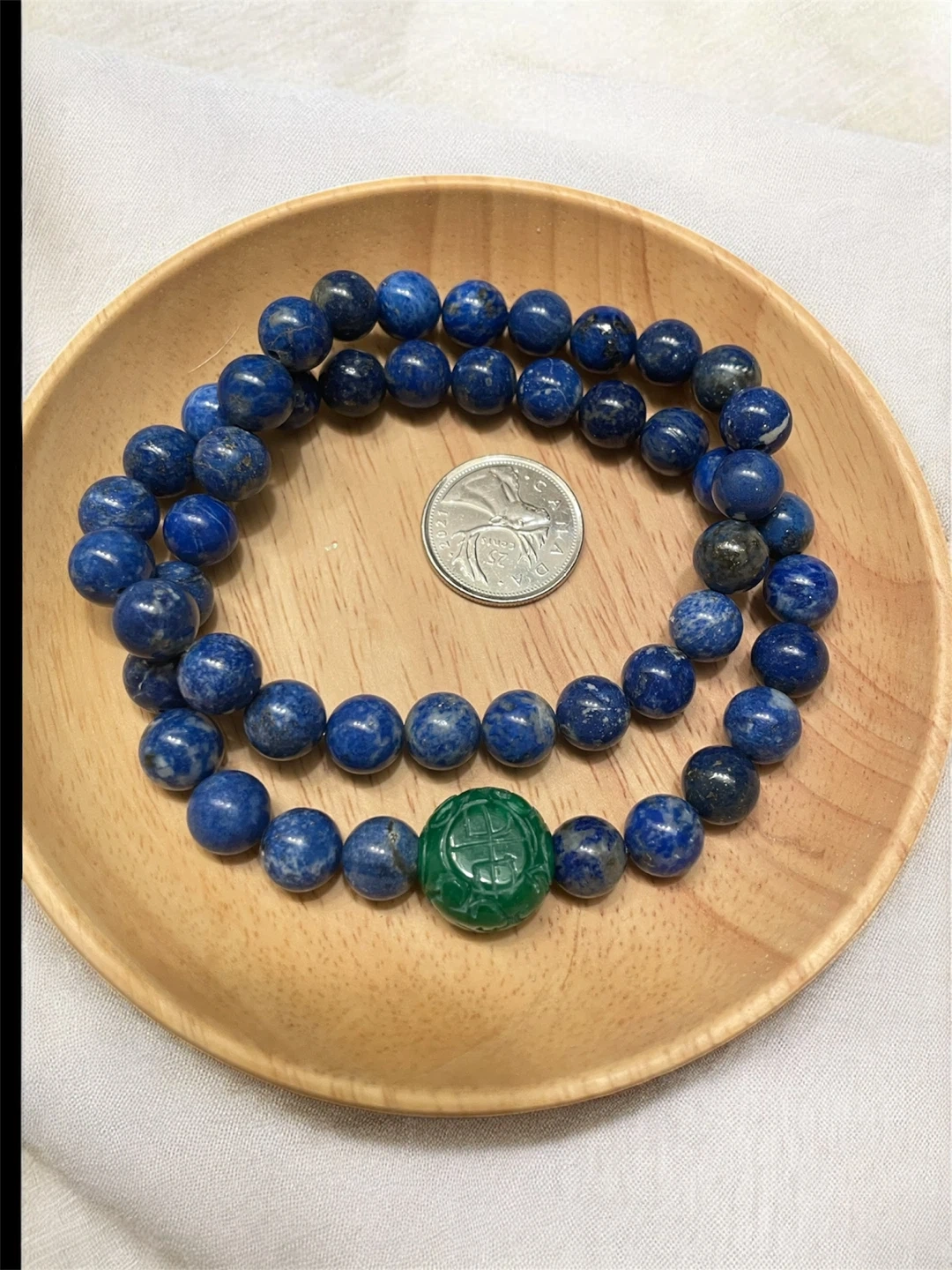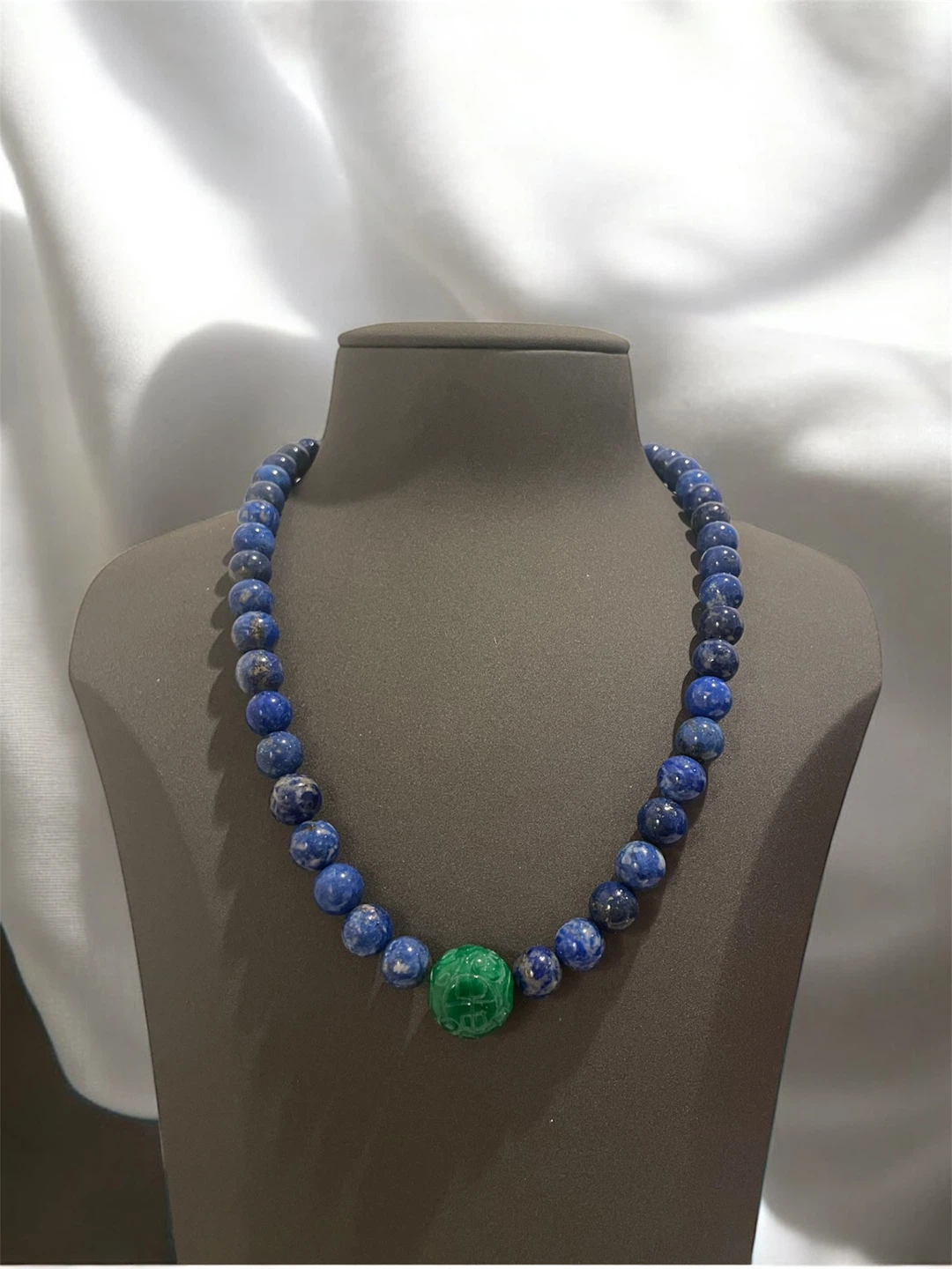 Beautiful blue lapis lazuli beaded necklace featuring a unique green stone accent! The beads are a lovely shade of blue, and the green stone adds a pop of colour and interest. It's a stylish piece that would look great with any outfit