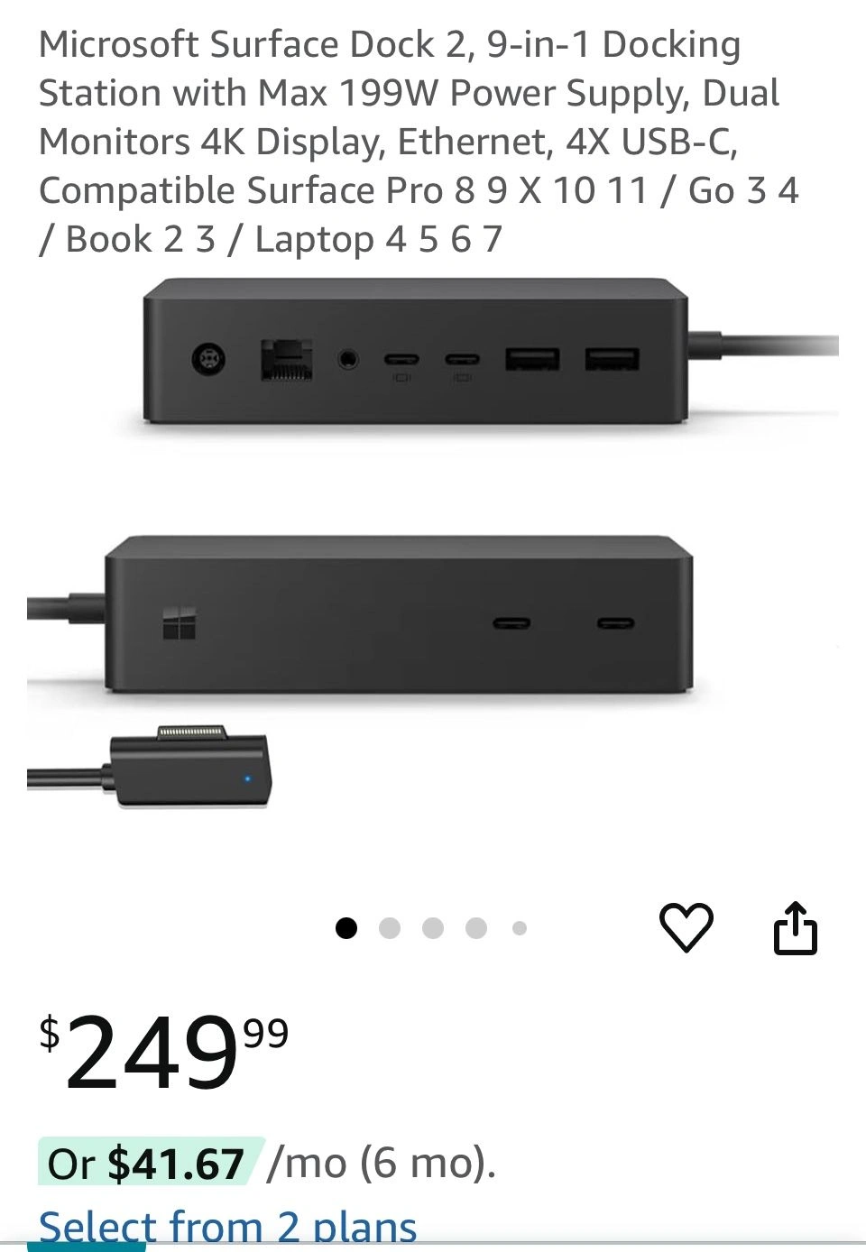 18Microsoft Surface Dock 2, 9-in-1 Docking Station with Max 199W Power Supply, Dual Monitors 4K Display, Ethernet, 4X USB-C, Compatible Surface Pro 89. Brand new only for $49