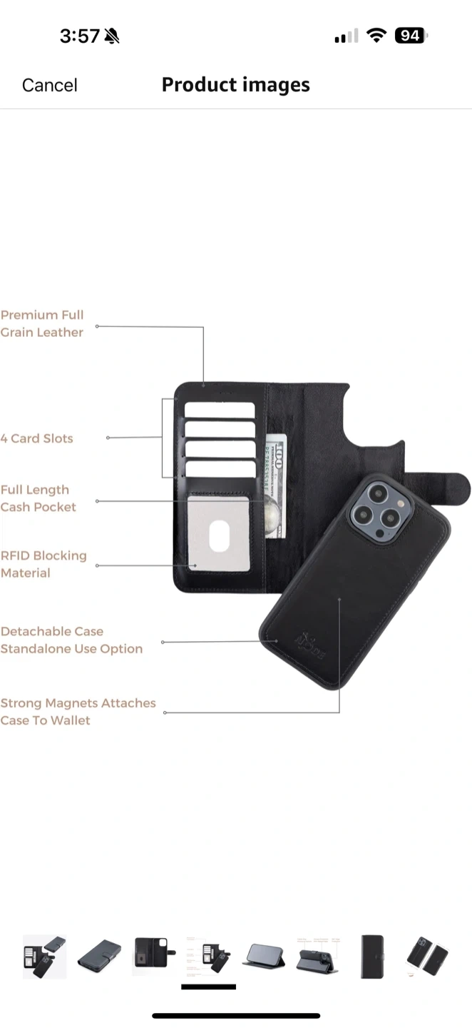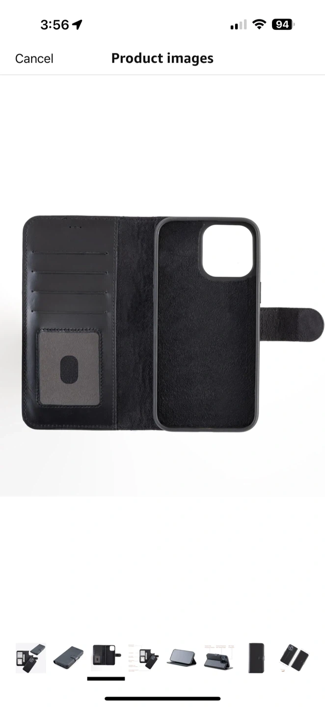 Selling a sleek black leather wallet phone case! It features premium full-grain leather and has four card slots, plus a full-length cash pocket. It also has RFID blocking material. The case is detachable, offering a standalone use option, and strong magnets attach the case to the wallet