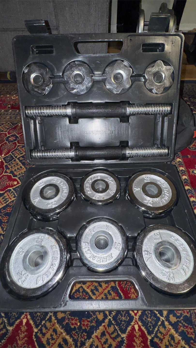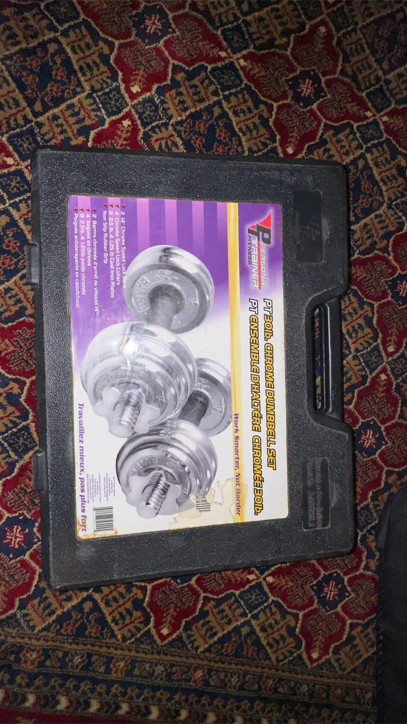 Selling a Precision Fitness chrome dumbbell set. It comes with a variety of weight plates and two dumbbell handles, all neatly organized in a carrying case. Perfect for your home workouts!
