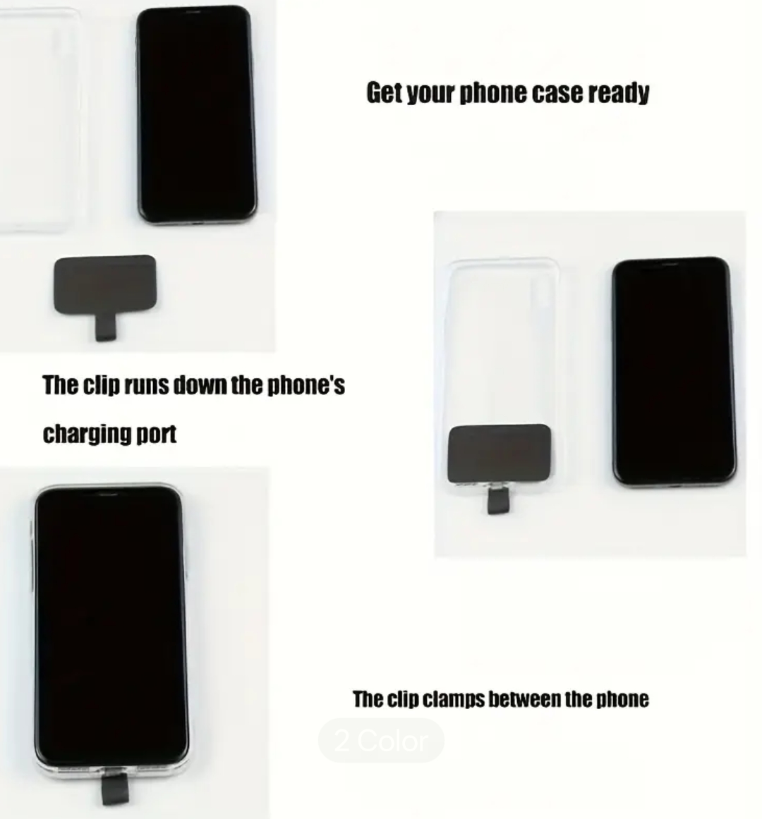 The clip runs down the phone's charging port, and the clip clamps between the phone and the case.