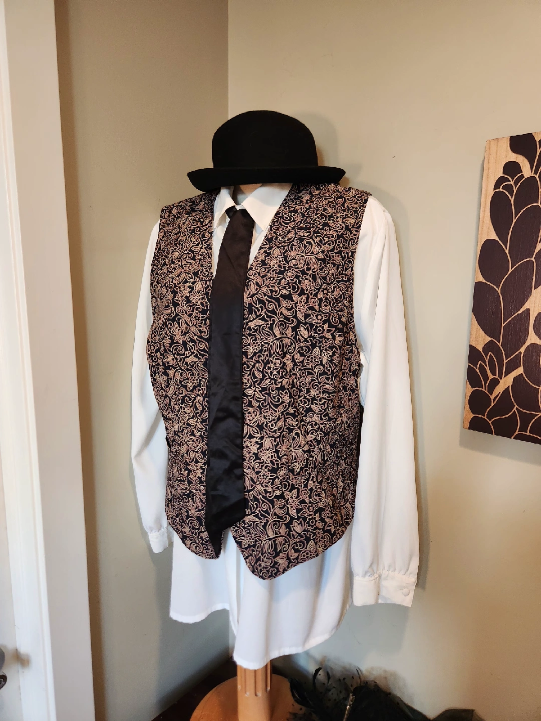 Selling a patterned vest. It has a black background with a light brown/gold floral pattern. Great for adding a touch of style to any outfit! under a blazer with denim, leggings or skirts. This dressy vest is a great addition to your wardrobe! size 20 (1x-2x)