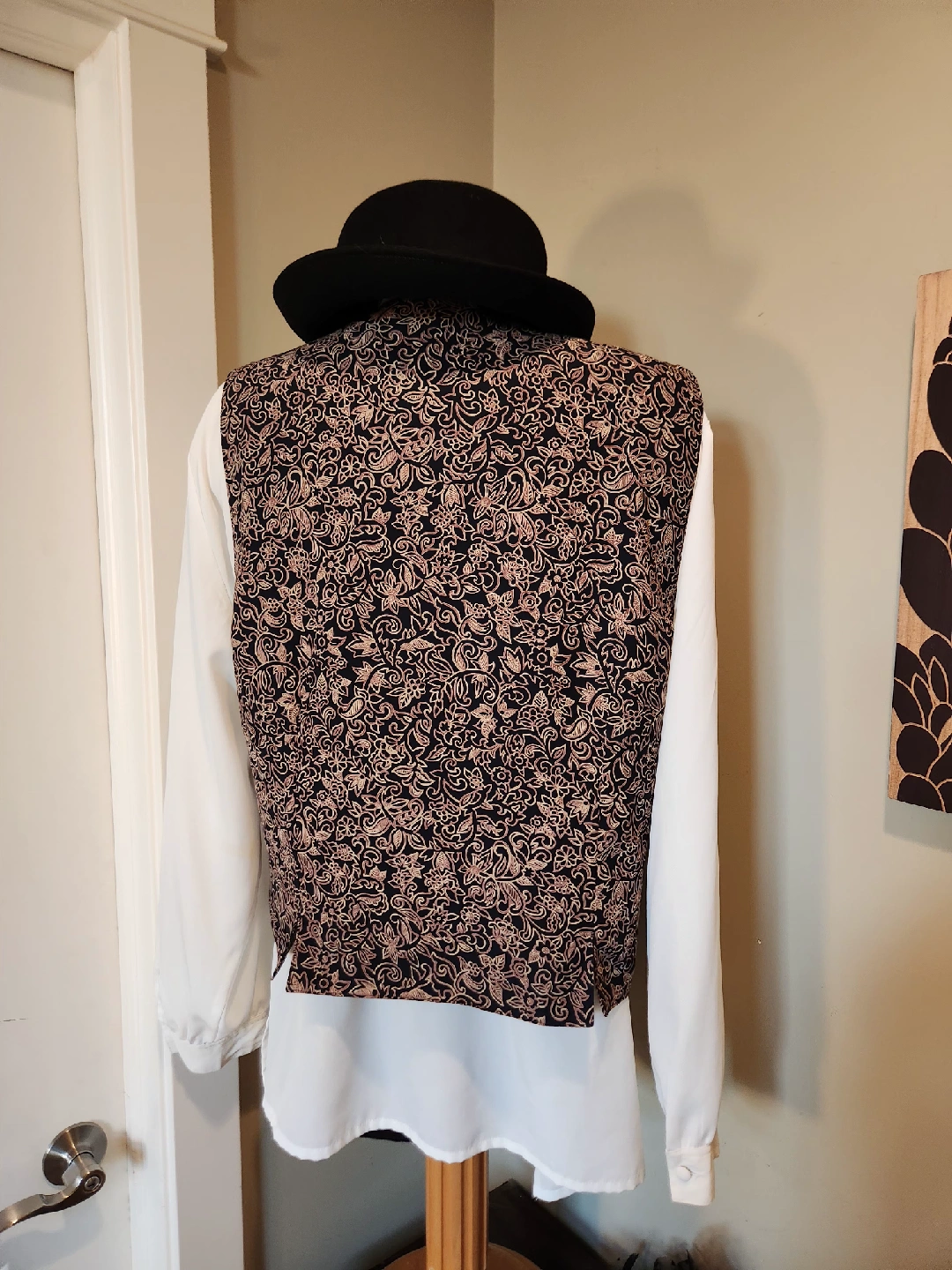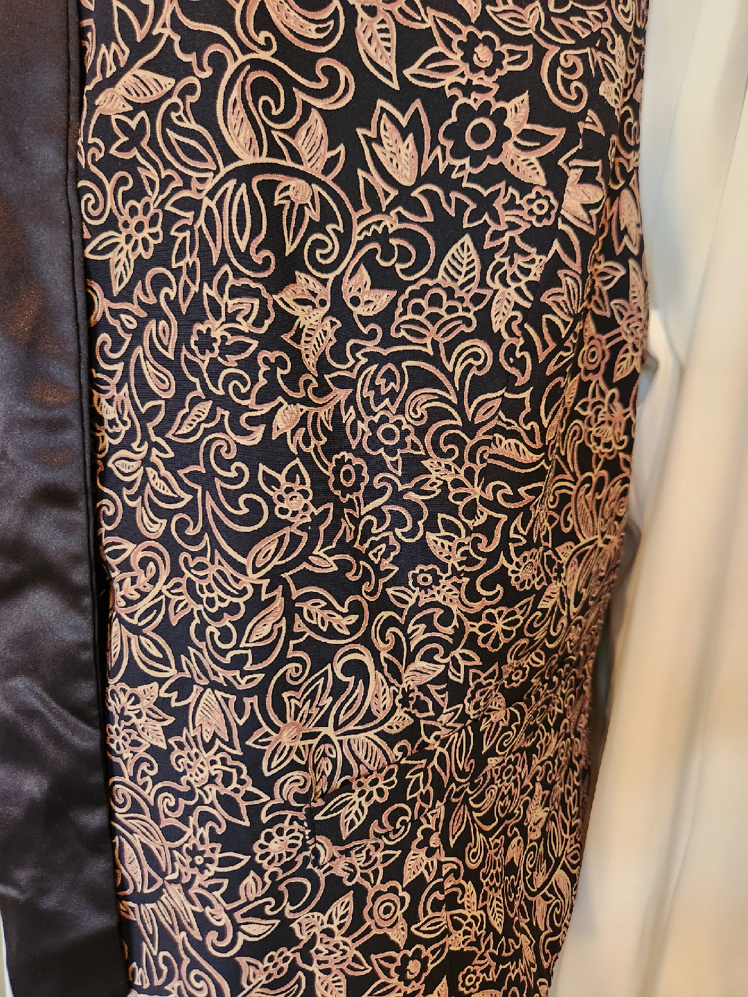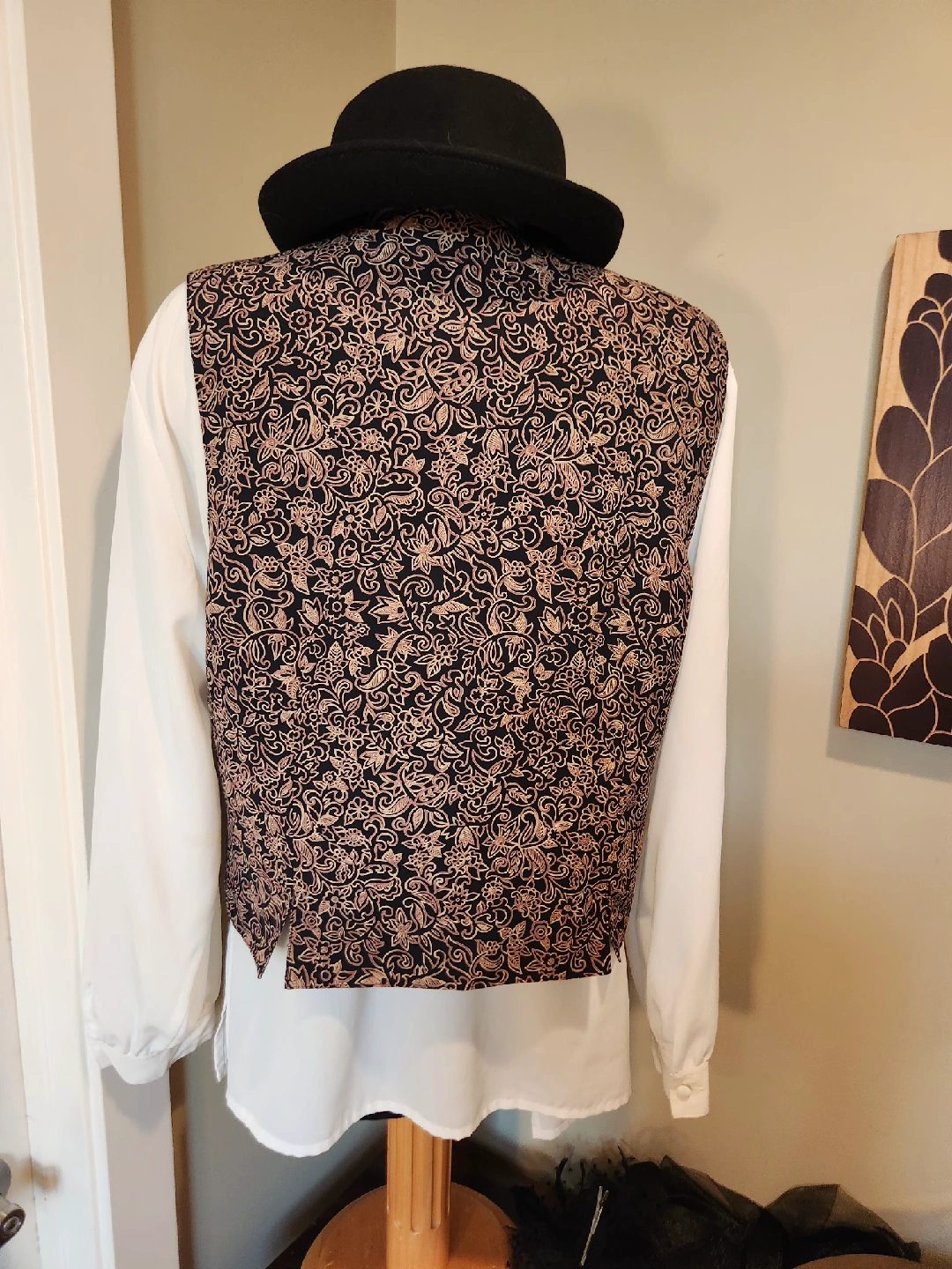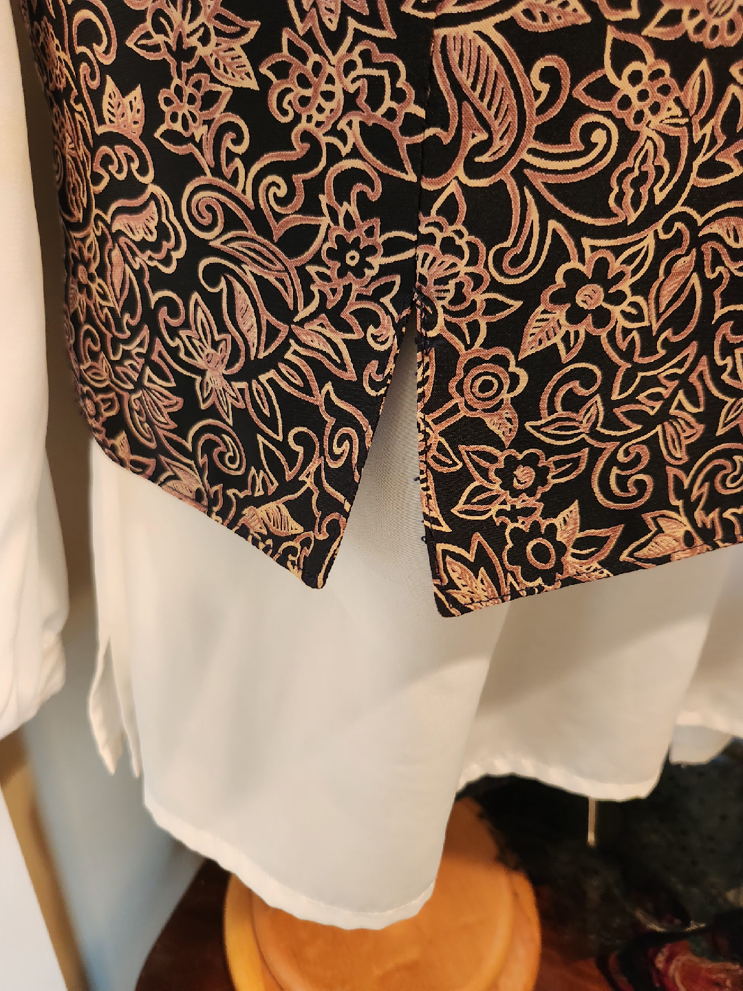 Selling a patterned vest. It has a black background with a light brown/gold floral pattern. Great for adding a touch of style to any outfit! under a blazer with denim, leggings or skirts. This dressy vest is a great addition to your wardrobe! size 20 (1x-2x)