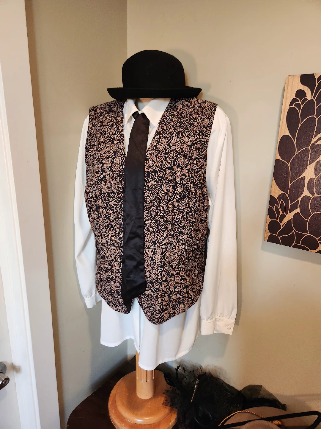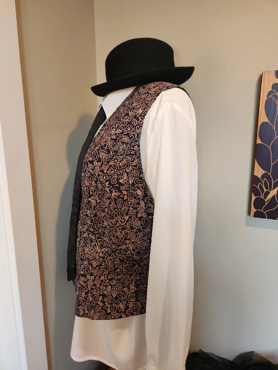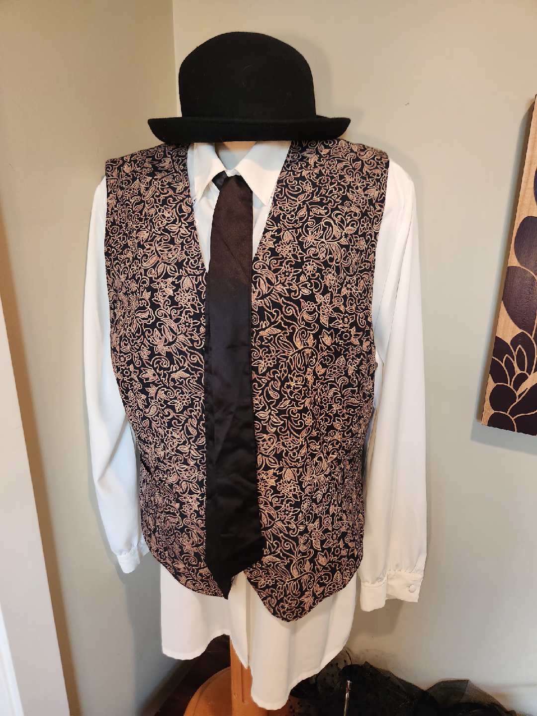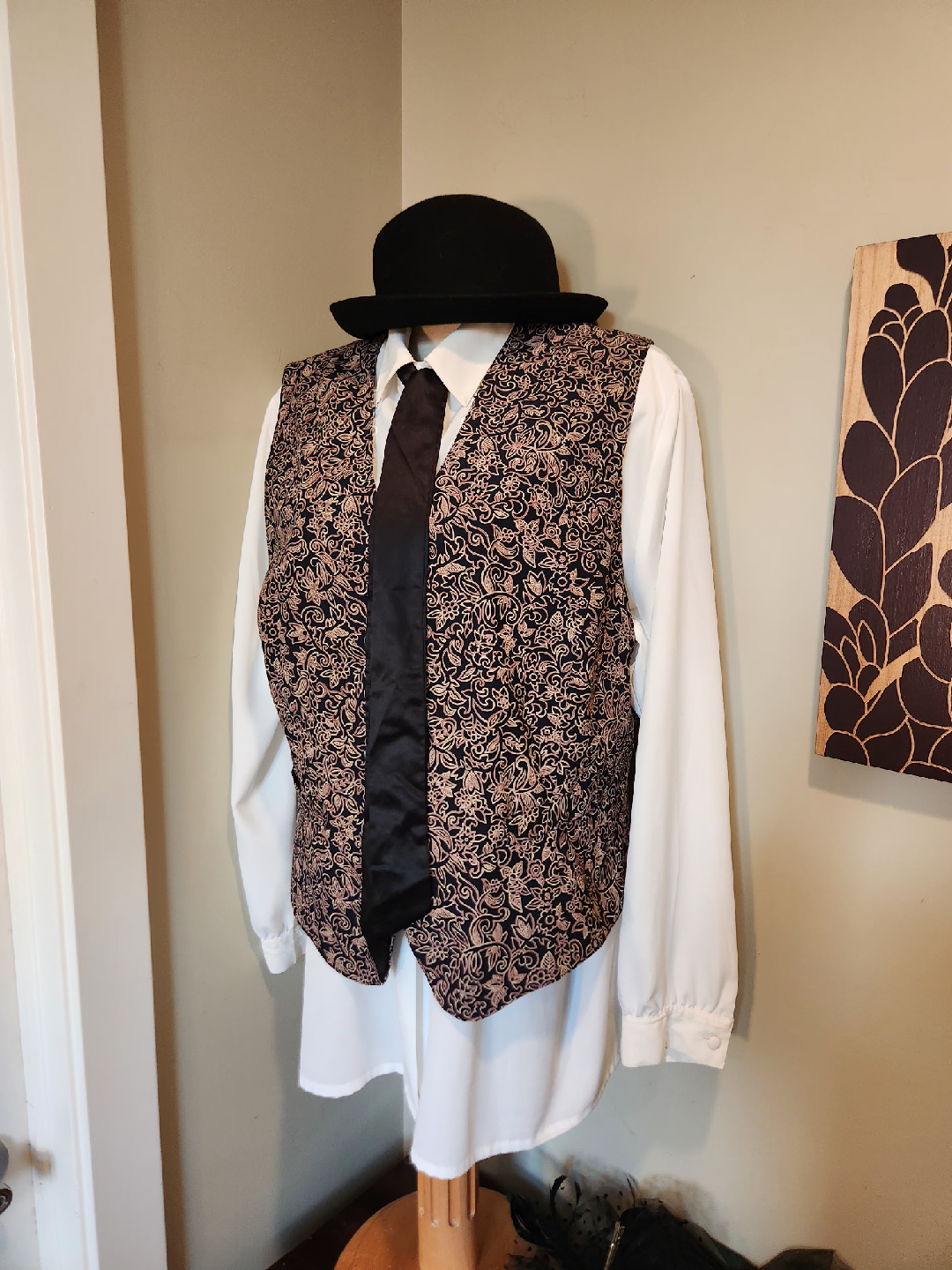 Selling a patterned vest. It has a black background with a light brown/gold floral pattern. Great for adding a touch of style to any outfit! under a blazer with denim, leggings or skirts. This dressy vest is a great addition to your wardrobe! size 20 (1x-2x)