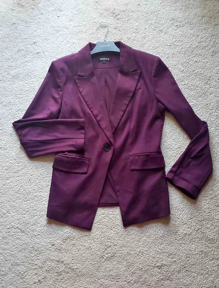 Purple blazer. Chest 36 in. Length 26 in. Long sleeves can be folded into three-quarter. Pick up at 40 Lavery Trail Scarborough M1C4T3 or 280 Donlands Avenue